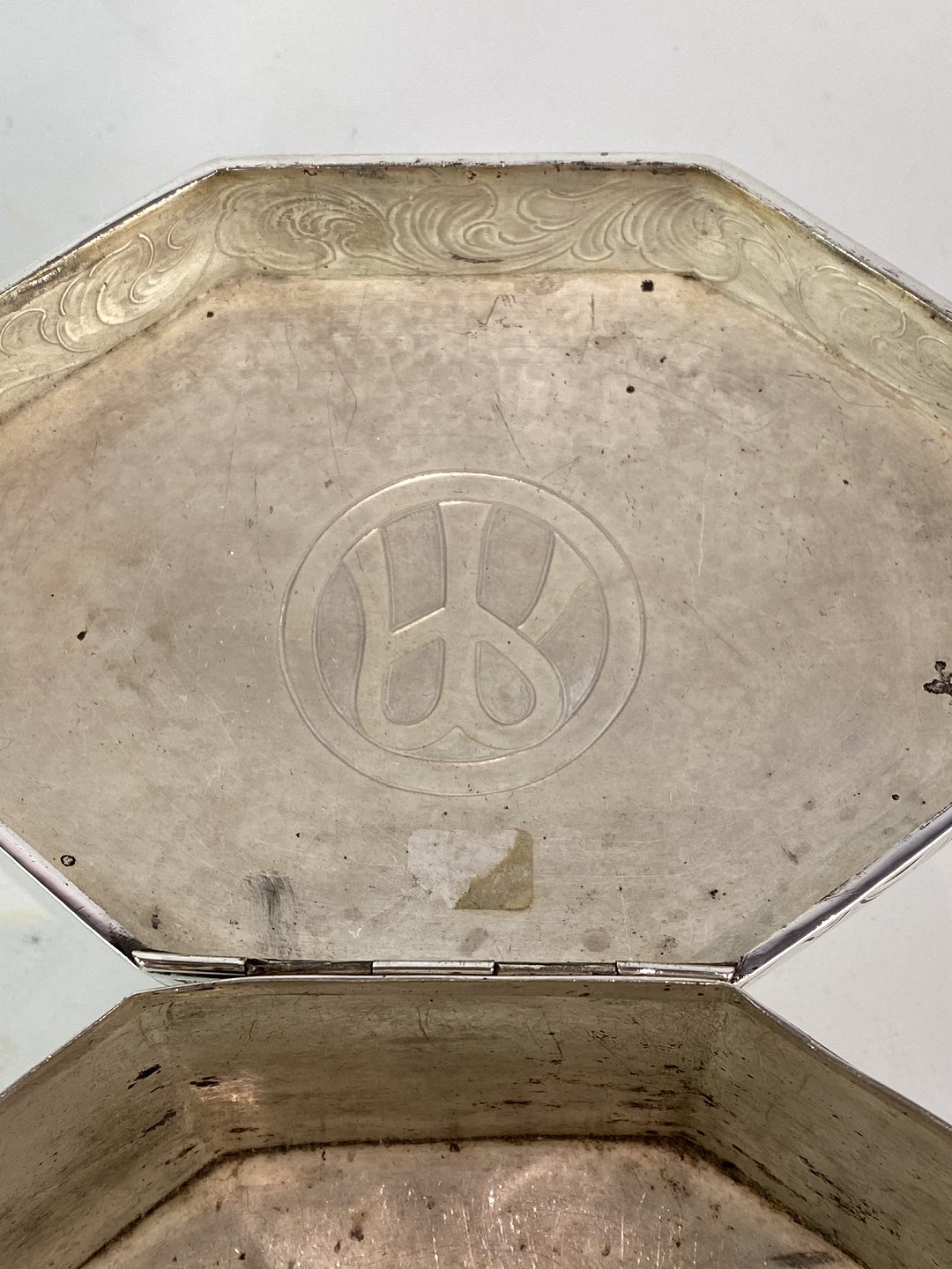 Beskrivelse: Skrin af 830 sølv, dekoreret med indgraveringer. Skrinet er ottekantet og fra 1940erne.