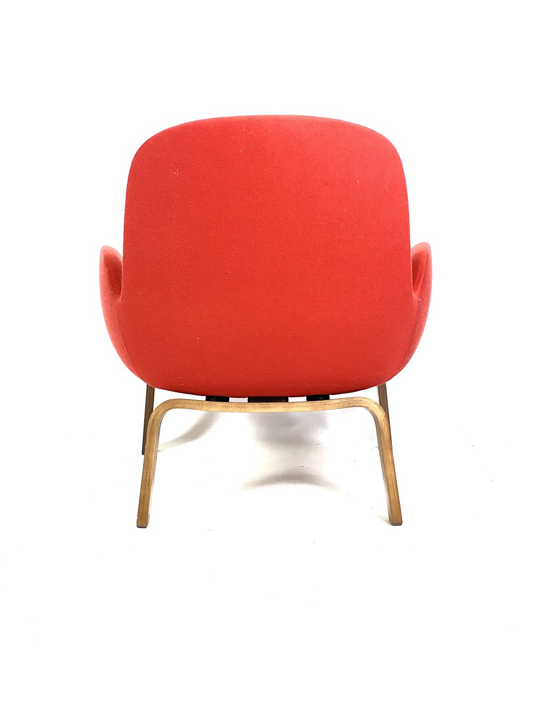 Easy chair with legs of walnut and upholstered with red fabric of Danish design for Normann Copenhagen.