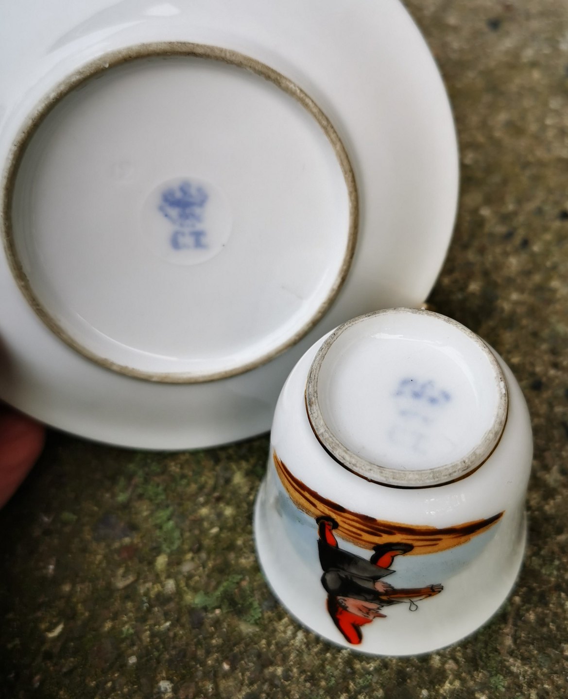 Beskrivelse: Lille moccakop i porcelæn fra C.T. Dekoreret med nisse gående med sin rissengrød ! I god stand. Ingen skader eller reparationer. Fremstillet omkring 1900. Koppen er 5½-6 cm høj og underkoppen 11½ cm i diameter.