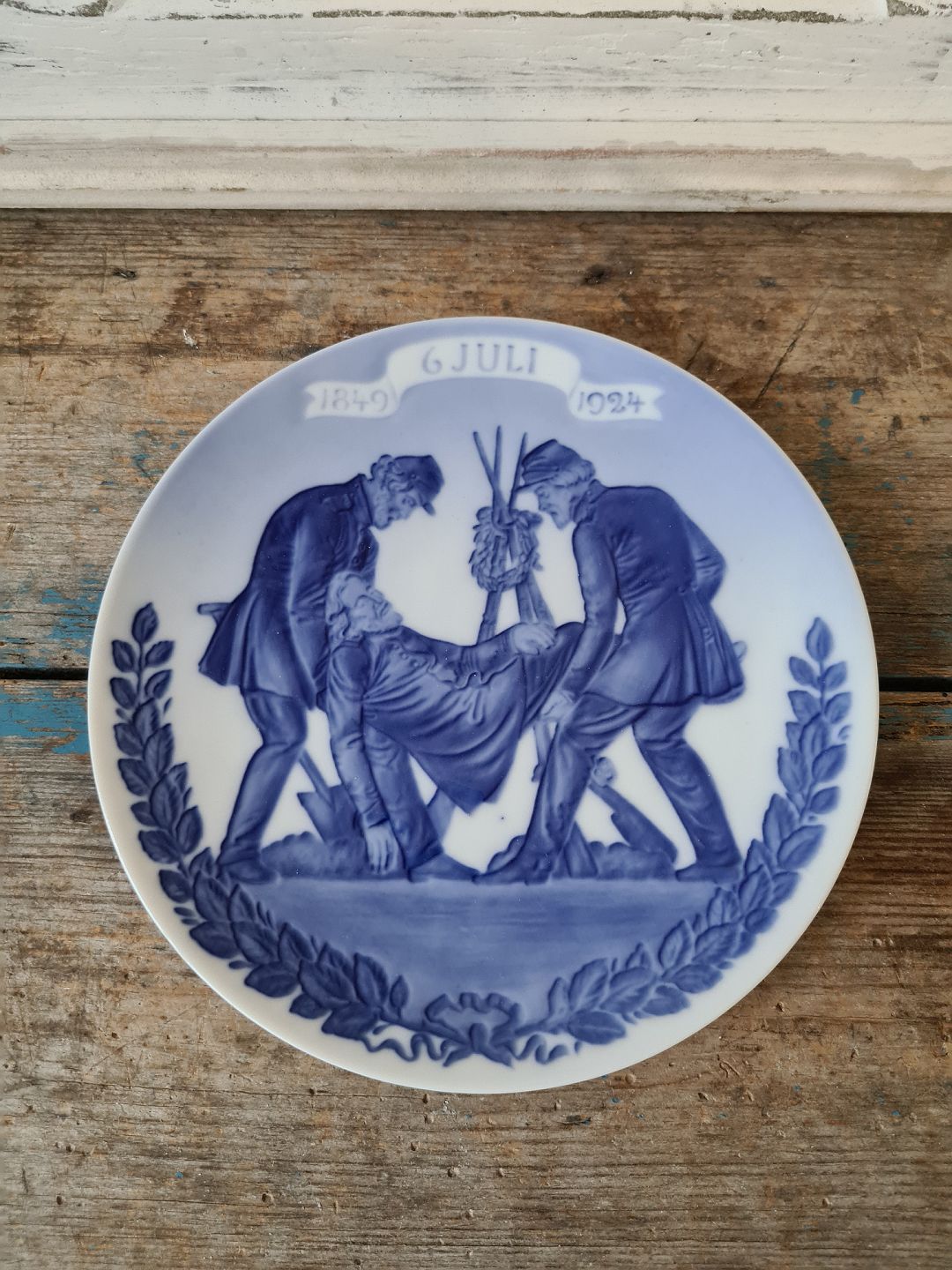 Description: Royal Copenhagen Memorial Plate 1924.Released on the occasion of the 75th anniversary of the Battle of Fredericia. Motif: 2 soldiers carrying the fallen soldier. Text: 1849 - 16 July - 1924