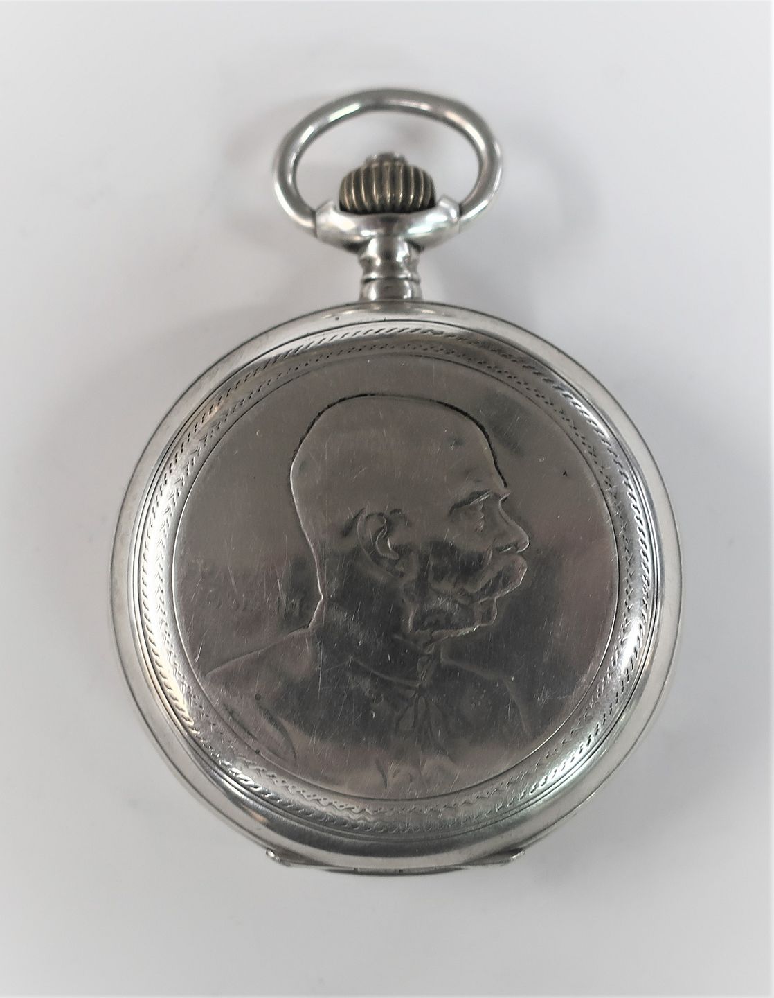 Dobbeltkapslet sølvlommeur. JWC. Forside: Kejser Franz Joseph. Bagside : østrigske dobbeltørn. Diameter 50 mm. Urværk er ok. K.u.K Hofuhrmacher, Friedrich Baumann Wien