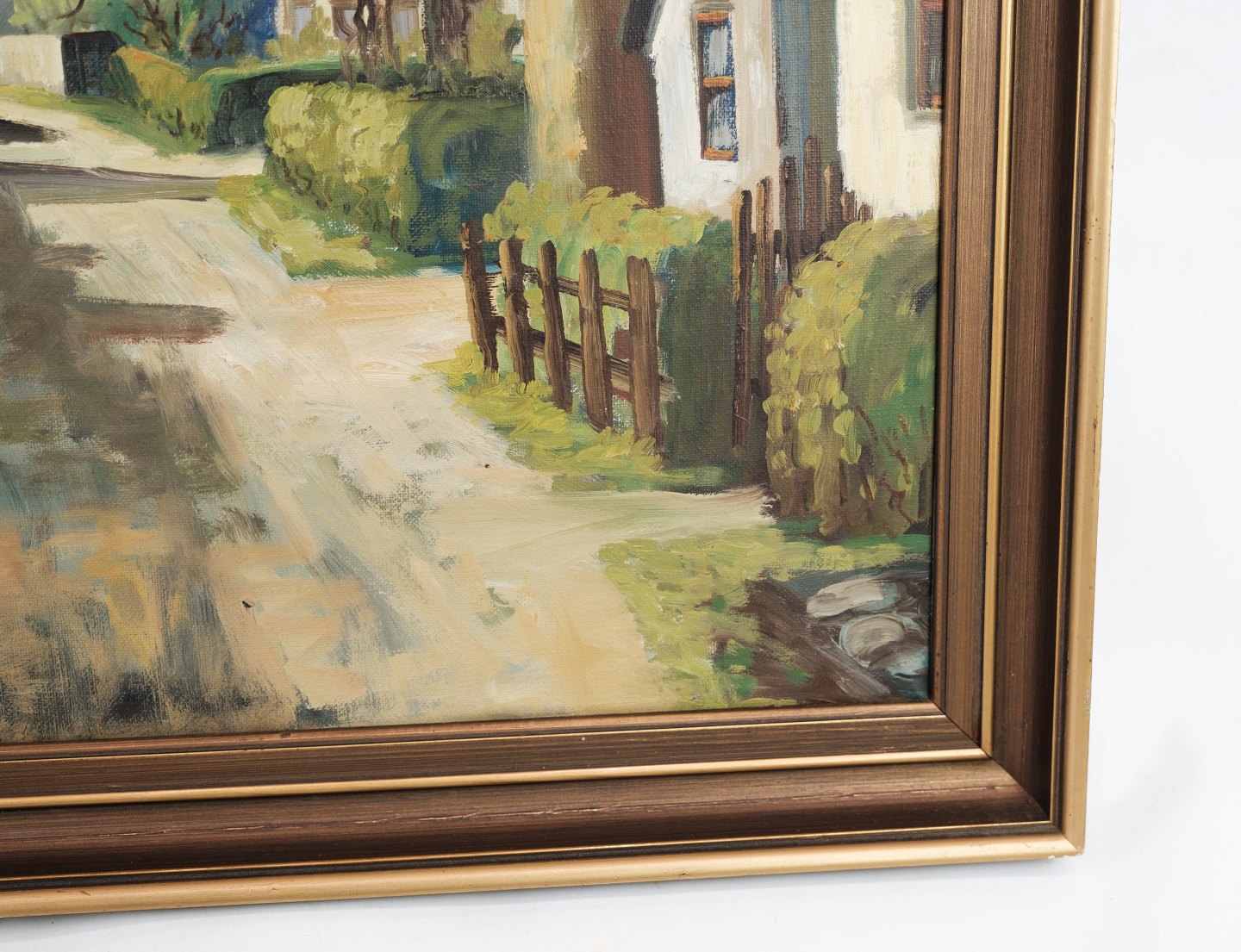 Beskrivelse: Oliemaleri på lærredet med motiv af landsby med fin ramme fra omkring år 1940'erne.