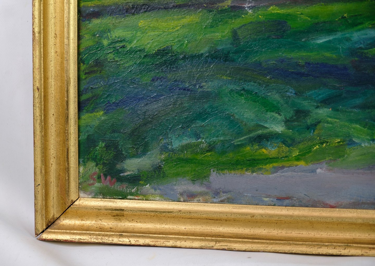 Oil painting on canvas with green and blue color shades painted by Sixten Wiklund from the 1950s. Dimensions in cm: H: 65 W: 89
