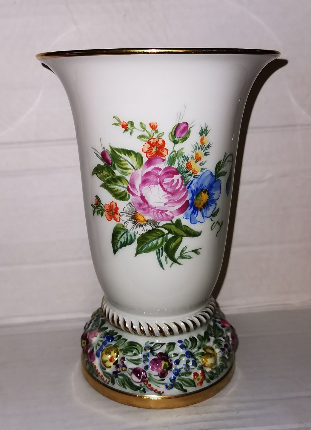 Description: Trumpet shaped vase in porcelain with foot on which there are "flower beds" in relief. Painted at the top ! Made at the German porcelain factory Rosenthal in the 1920s. Appears in good condition without damage or repairs. H. 17 cm (6.69 inches)