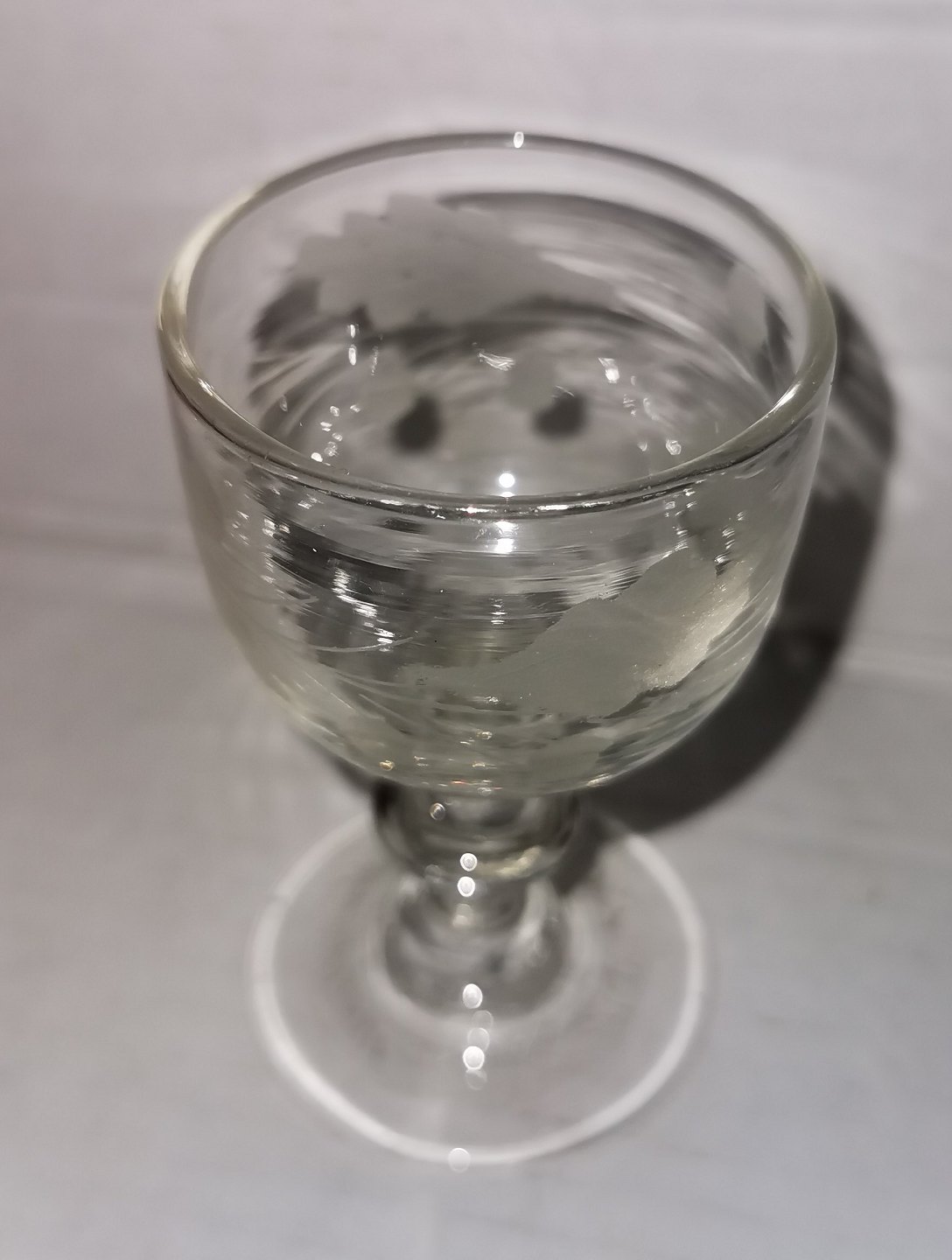 Description: Holmegaard Glasværk: Vinglas med egeløvsslibning. Fremstillet anden halvdel af 19. århundrede. Fremstår i god stand uden skader eller reparationer. H. 9½ cm.