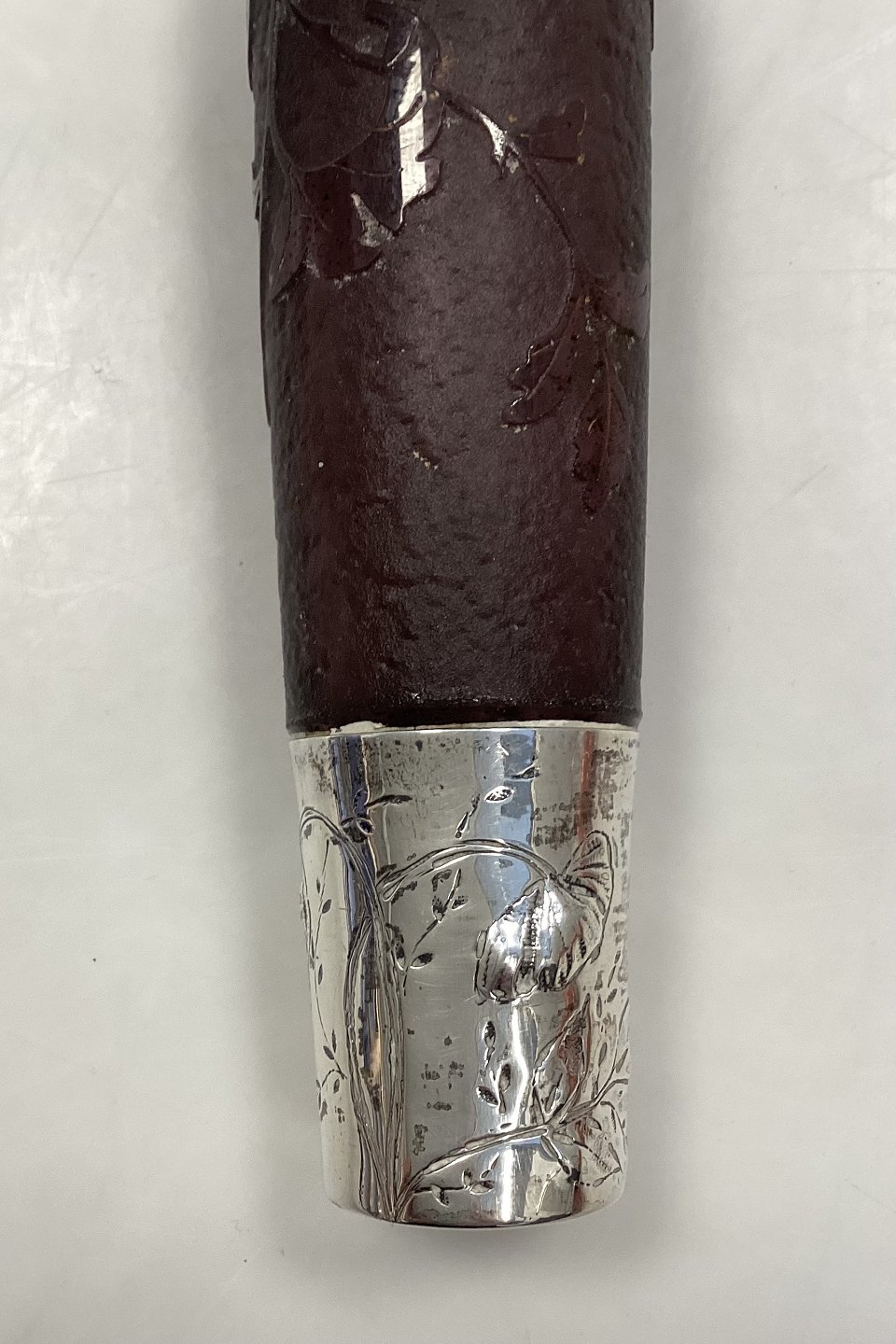 Beskrivelse: Fransk Antik Art Nouveau flacon i bordeaux glas med blomsterdekorationer og bladværk i relief fra slutningen af 19. årh. I både top og bund sølvmontering med sølvstempel. I god stand. Ingen skader. H. 15 cm (5.91 inch)
