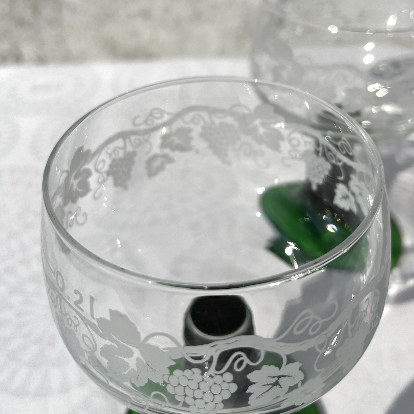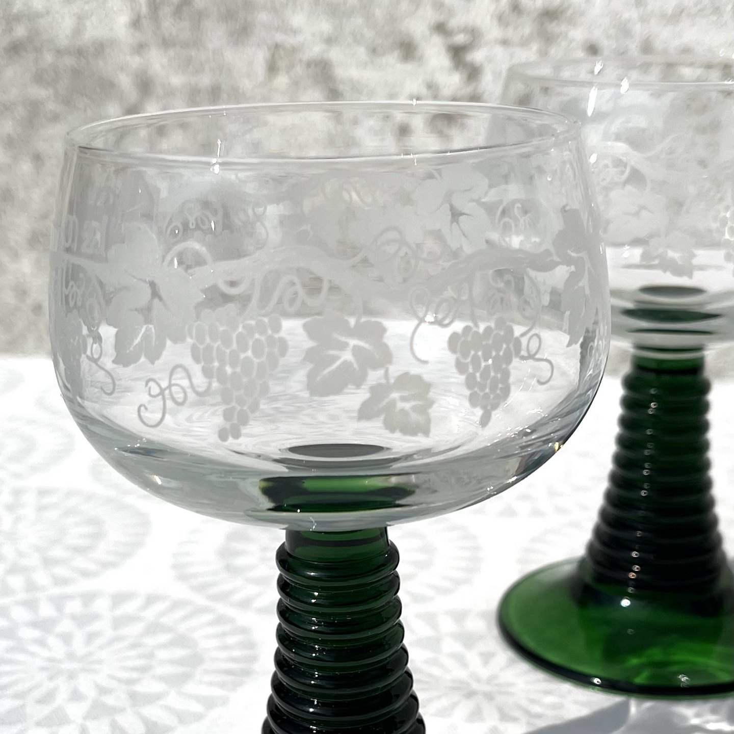 Beskrivelse: Franske “Rømerglas” Rødvin, 8cm i diameter, 13,5cm høj, Med druer & blade *Perfekt stand*