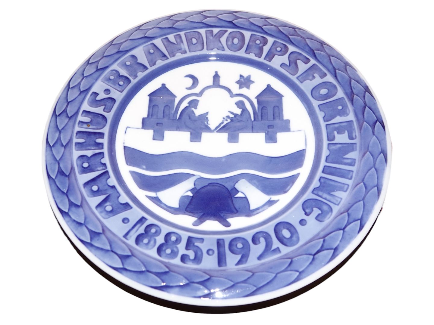Beskrivelse: Royal Copenhagen Mindeplatte fra 1920, Aarhus Brandkorpsforening 1885-1920.