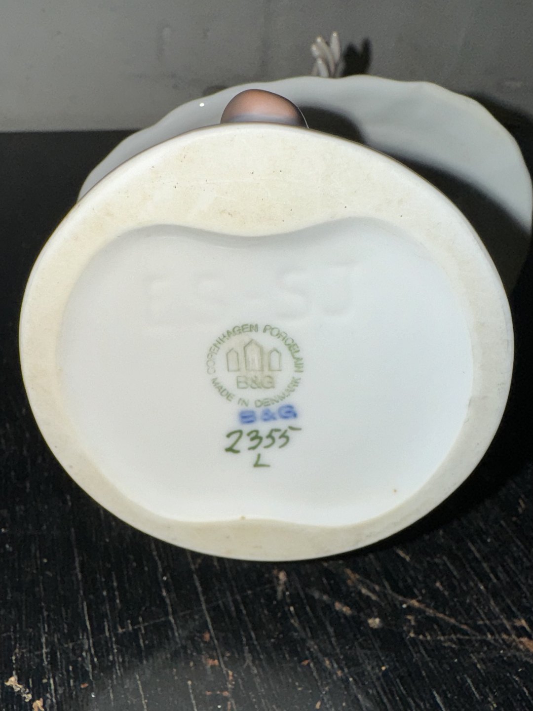 Description: Porcelain figure of Columbine from Bing & Grondahl. 2nd grade. Small “pin prick” on the dress and “wear” on the edge of the dress. Factory mark on the bottom. Model number 2355. H.25½ cm high (10.03 inches).