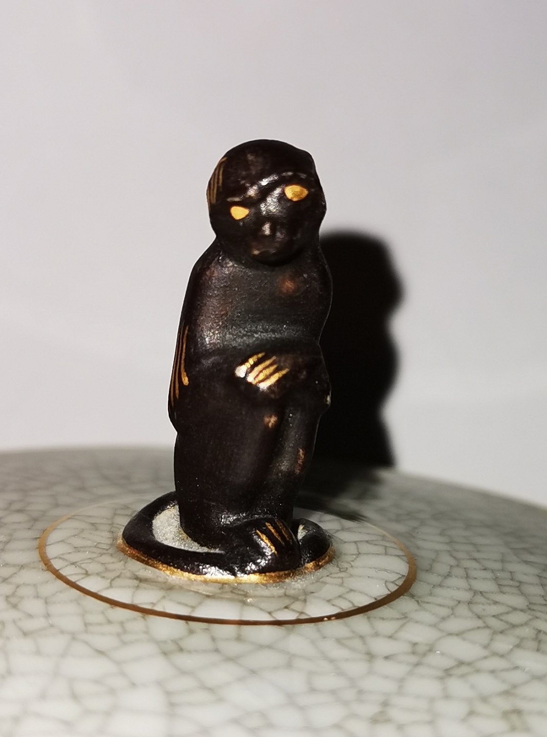 Beskrivelse: Lille rund skål med låg fra Royal Copenhagen. Krakkeleret dekoration i gråt og rødt. På toppen af låget ses lågknop i form af figur af siddende abe. I god stand uden skader eller reparationer. 1. sortering. H. 7½ cm (2.95 inches).