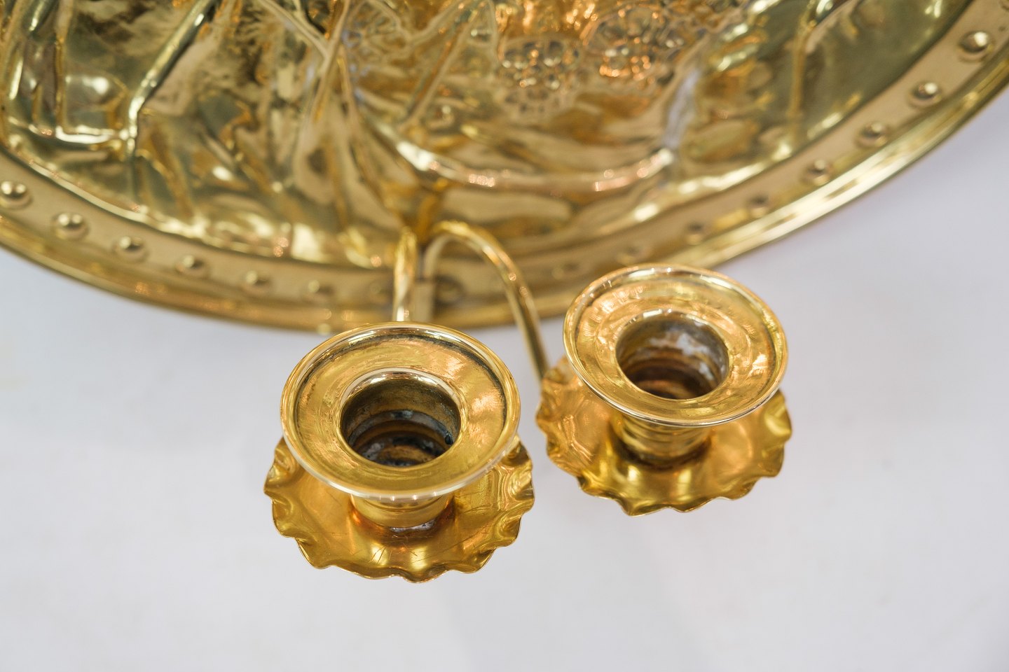 Beskrivelse: Et par antikke messing væglysestager fra omkring år 1860'erne.
