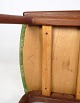 Stolene har en karakteristisk form, der giver en unik og attraktiv stil. Med deres udskårne ryglæn i form af en boomerang, giver de en unik og ergonomisk form til ryggen. Sædet er polstret med grønt stribet stof, hvilket skaber en smuk kontrast til den varme farve af teaktræet.