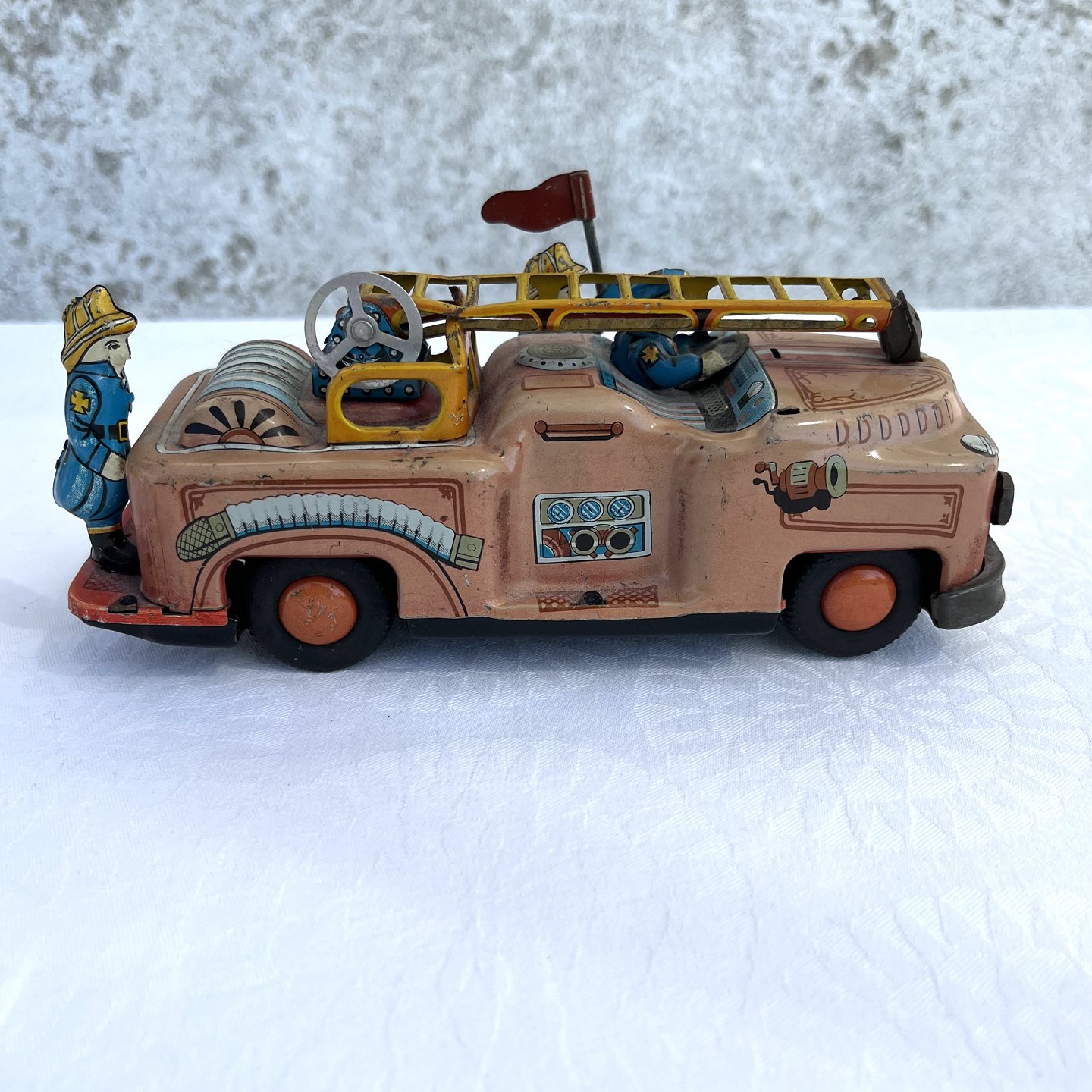 Description: toy tin fire engine. When you drive the car, the flag swings up and down and a bell rings. 19cm long, 7.5cm high *Nice used condition*