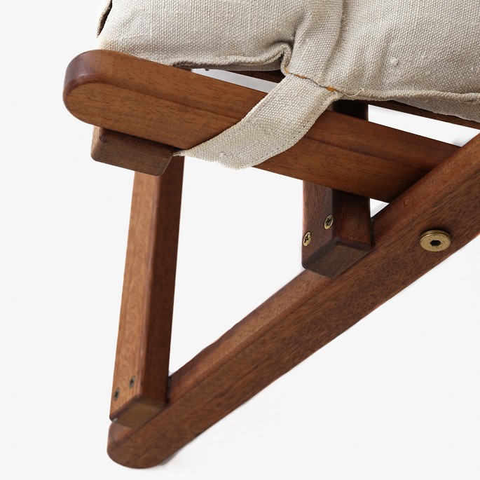 Deck chair with mahogany frame and washed canvas cushion. Designed in 1968.