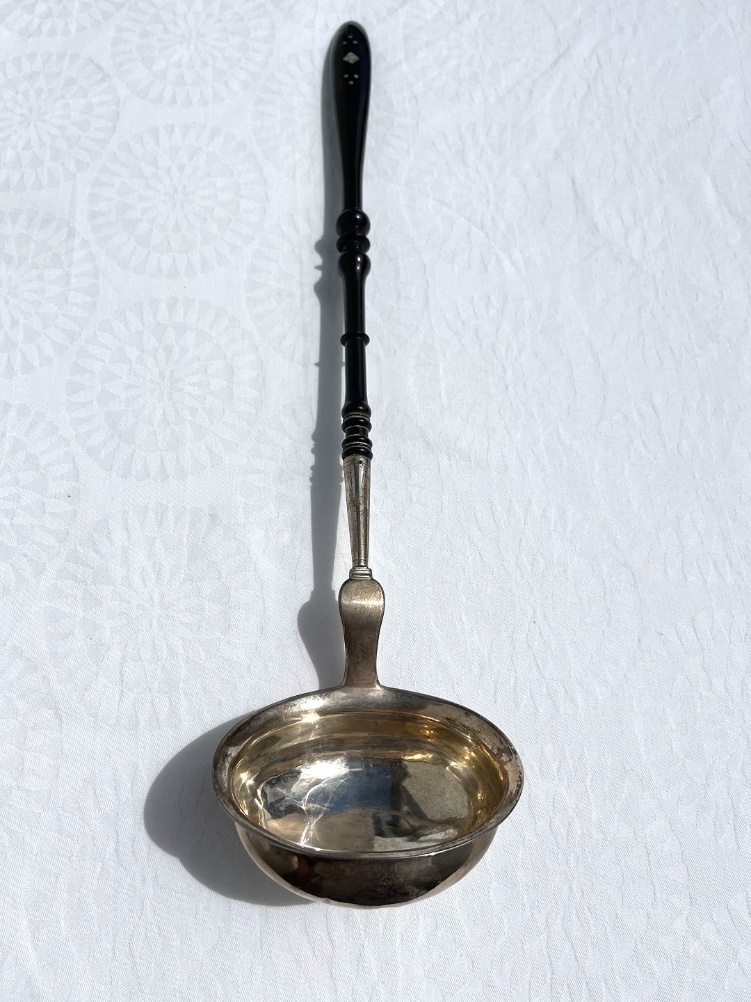 Beskrivelse: Punchske / Potageske med træskaft med perlemorsindlægninger, Stemplet lidt utydeligt se sidste foto. 10cm bred, 41cm lang * Enkelte småbuler i bunden af skeen
