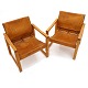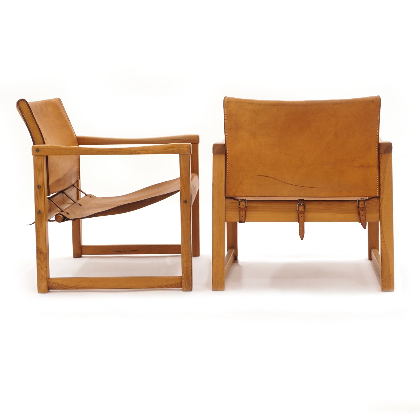 Beskrivelse: Et par "DIANA" lounge stole i fyrretræ med patineret cognacfarvet læder sæde og ryg