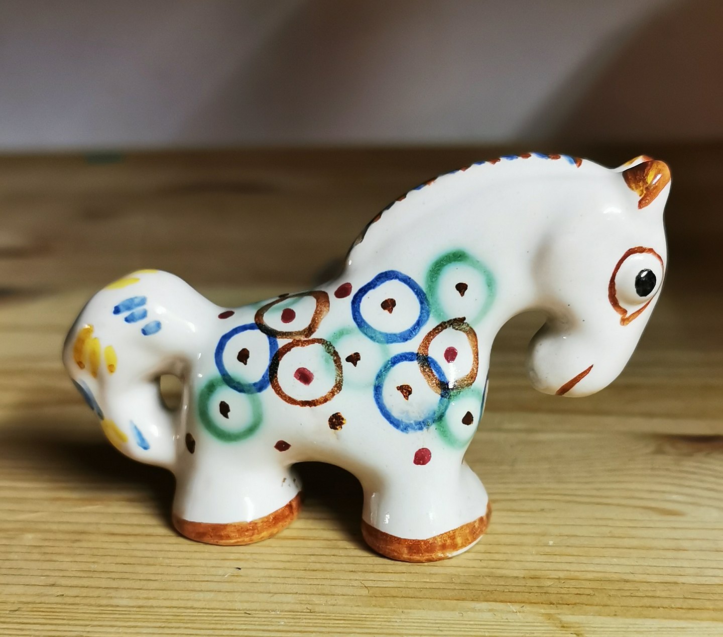 Beskrivelse: Figur i keramik af bemalet hest. Fremstillet Hos Lauritz Hjorth, Bornholm. Har to små skår. Se fotos. Fabriksmærket på undersiden. Mål: H. 5½ cm L. 9 cm.
