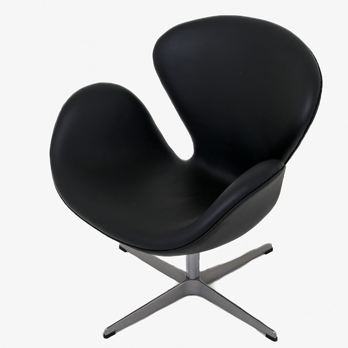 AJ 3320 - Nybetrukket 'Svanen'-lænestol i sort Savanne-læder (semi-anilin) på aluminiumsfod. KLASSIK tilbyder 'Svanen' i læder efter eget valg. Kontakt os venligst for mere information.