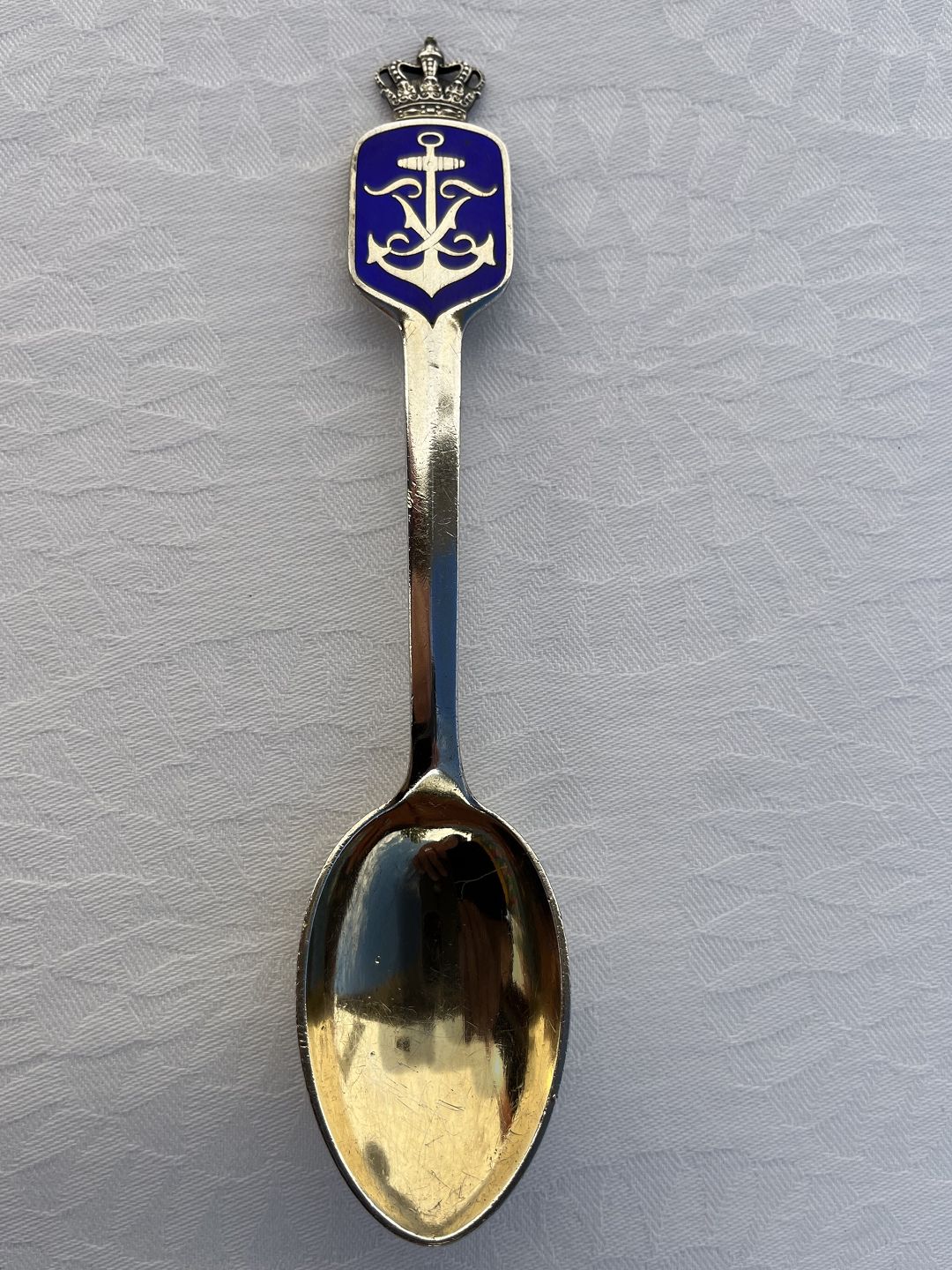 Description: Silversmith A. Michelsen. Memorial spoon in gold-plated sterling silver. Published on the occasion of King Frederik IX's 50th birthday in 1949. Length 16 cm. Design: Ibi Trier Mørch.