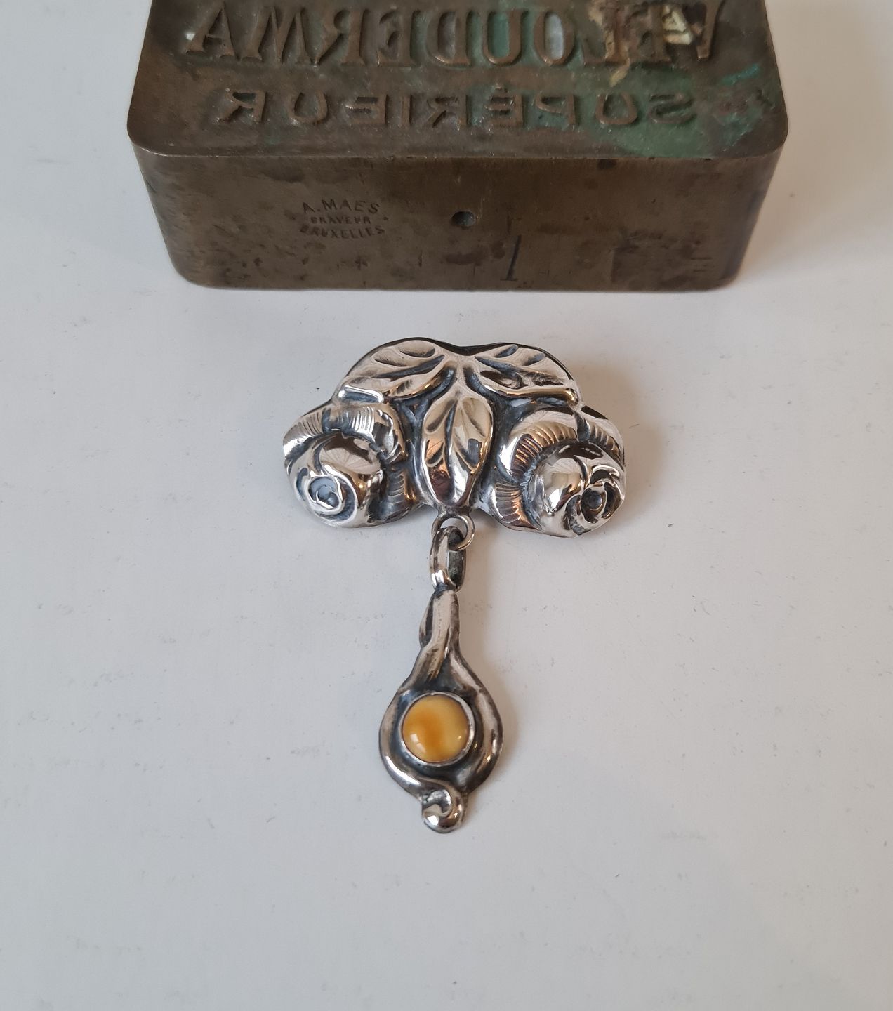 Beskrivelse: Vintage sølvbroche i form af roser med rav vedhæng