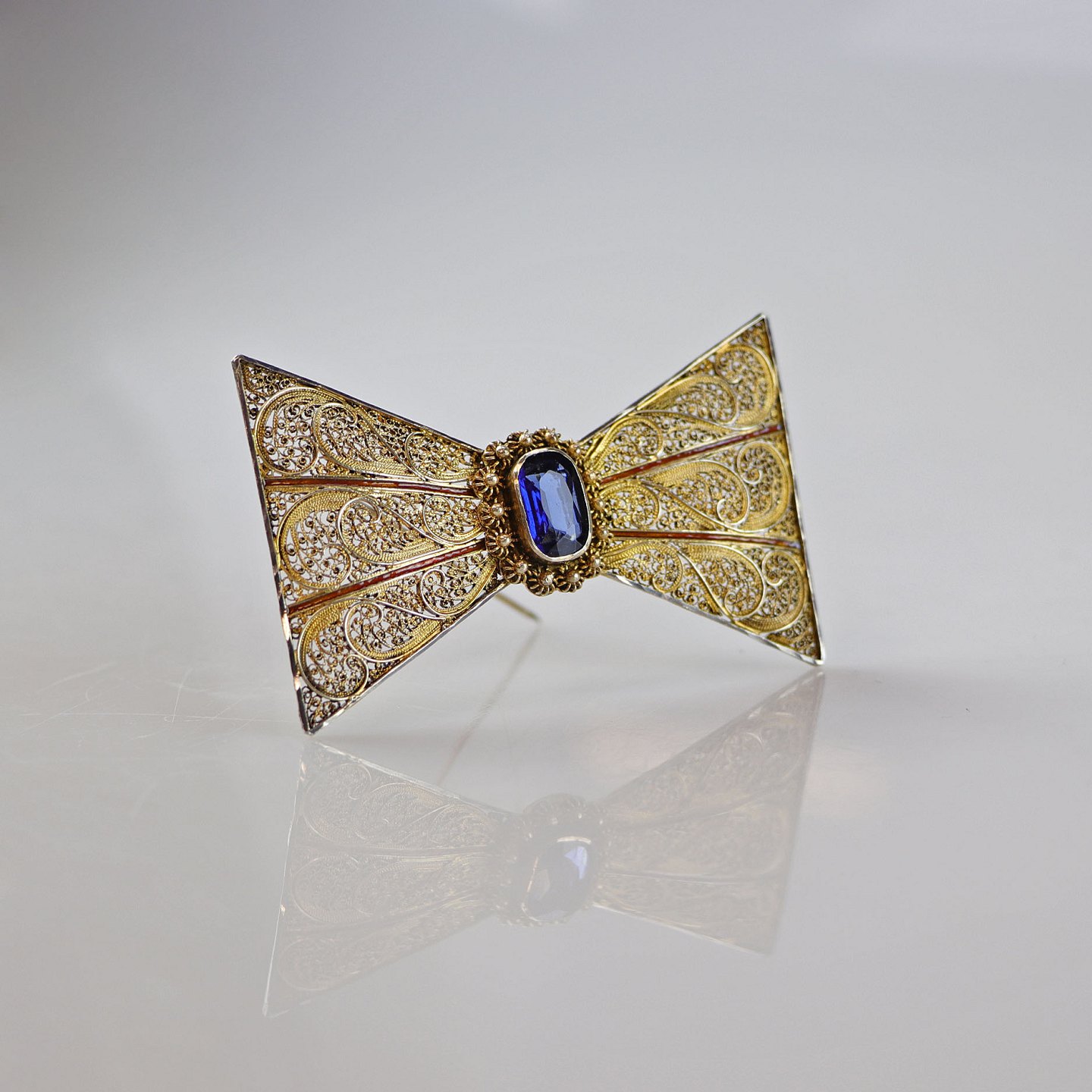 Beskrivelse: Forgyldt sølv broche formet som en sløjfe,
