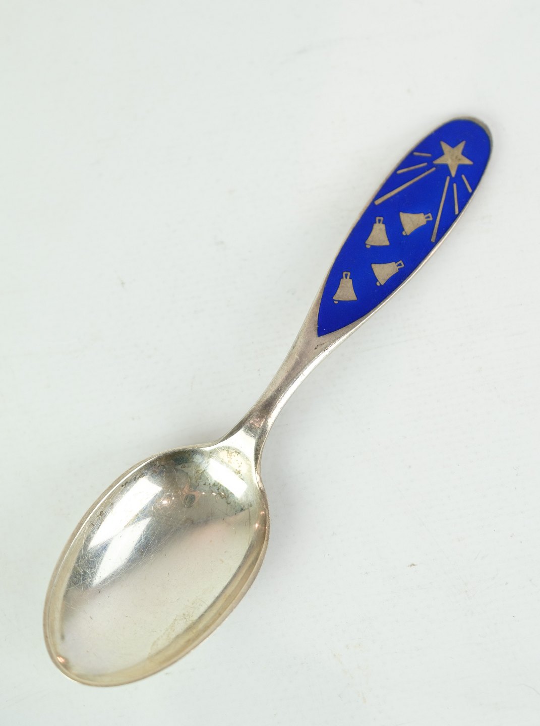 Description: Christmas box by P. Hertz in sterling silver, Denmark with a blue enamel with Christmas bells and star on it