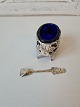 Beskrivelse: Svensk saltkar i sølv og blåt glas samt tilhørende saltske