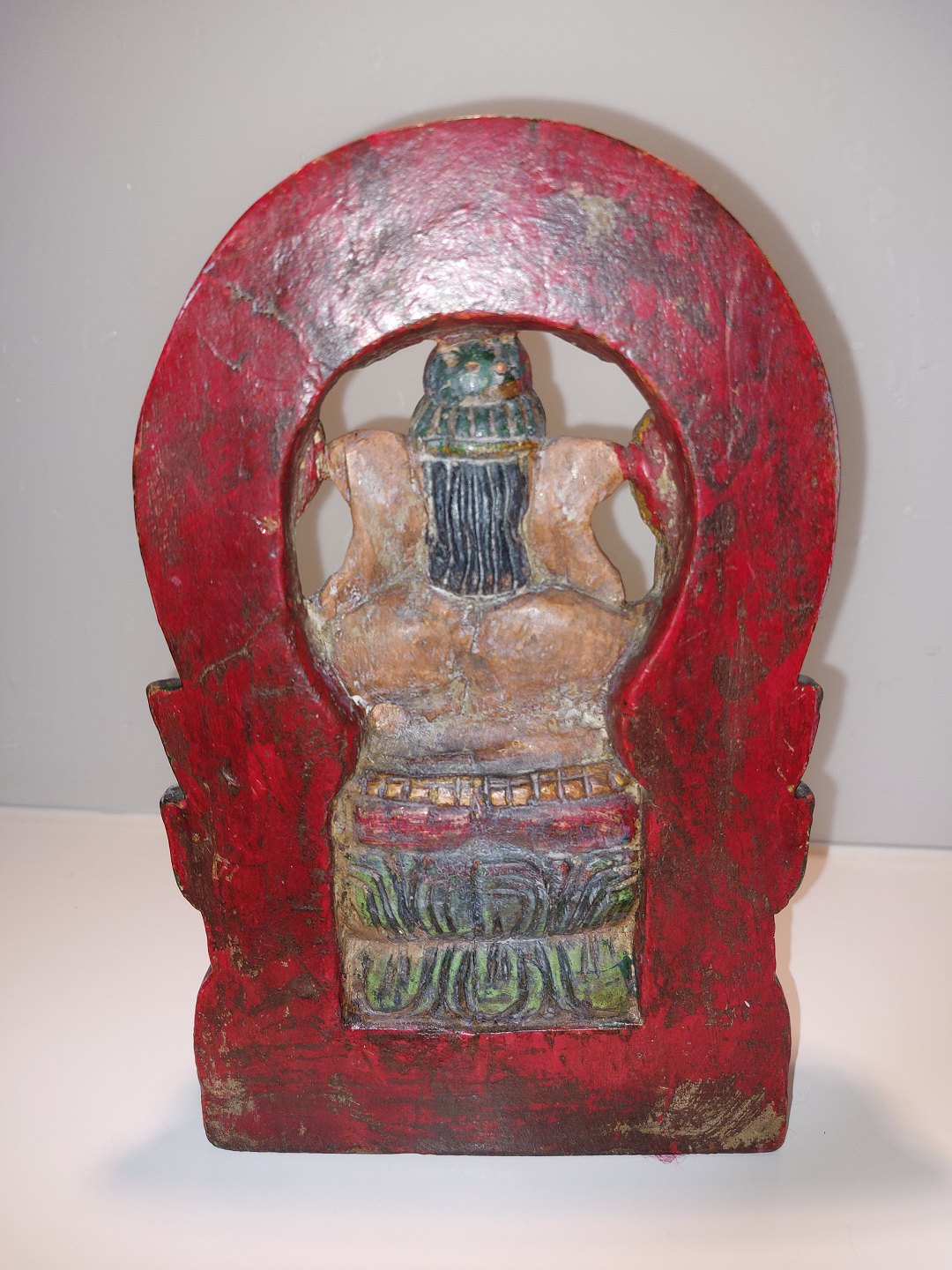 Beskrivelse: Bemalet figur skåret i træ forestillende den indiske elefantgud Ganesh. Fremstår I god stand. Mål: H. 24,5 cm L. 15,5 cm D. 6,5.cm
