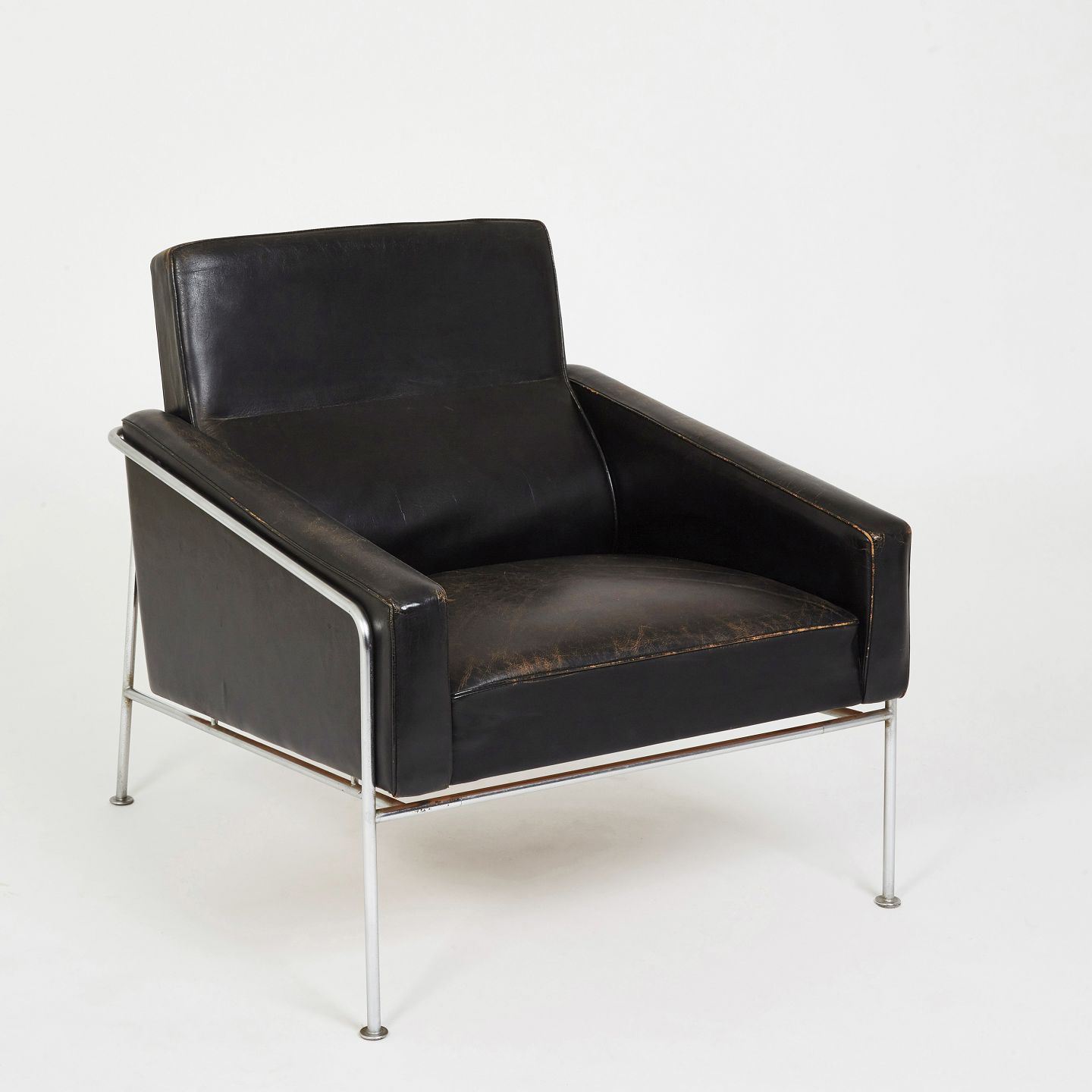Description: Arne Jacobsen "Airport chair" in original black patinated leather, chromed steel frame.From the 1960'ties.