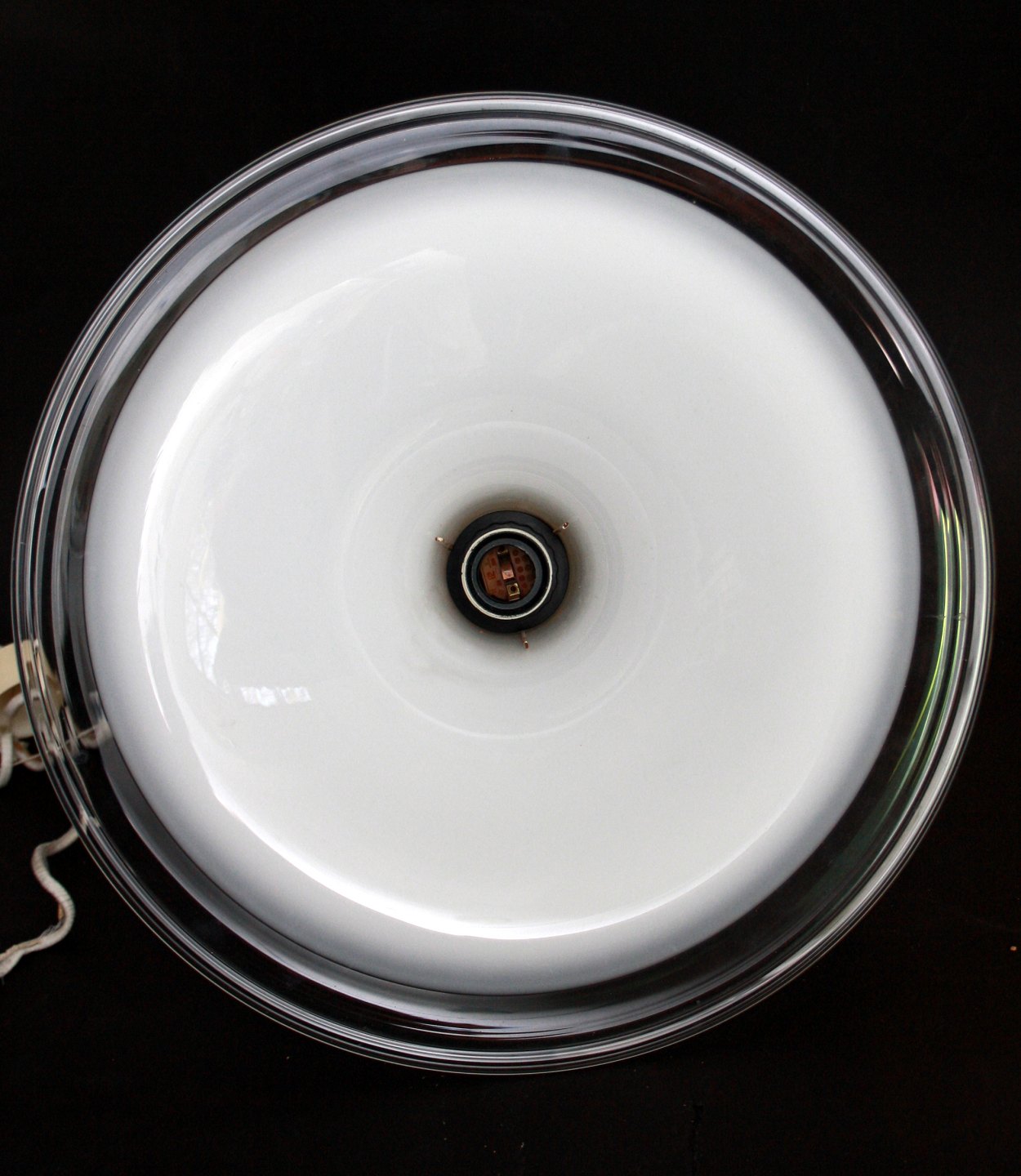 Beskrivelse: Holmegaard, Etude lampe i opalinehvid glas med klart omfang. Designet af Michael Bang i 1978. Højde 29,5 cm. Diameter 37-39 cm. Pris: 800 kr. stk. Lager: 3