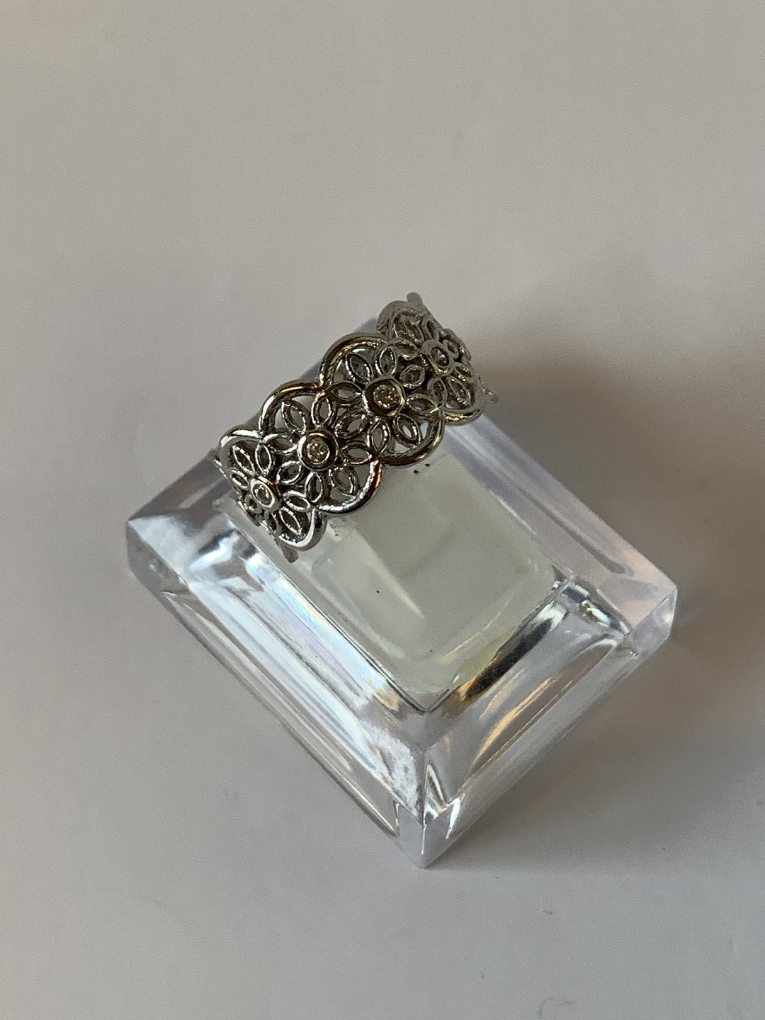 Description: Ladies' ring in 14 karat white gold, with inlaid clear stones