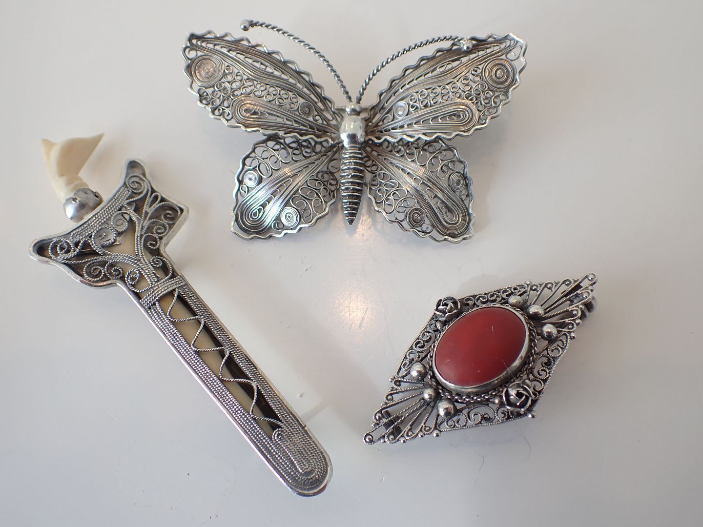 3 filegranbrocher i sølv - Sværdbroche, sommerfuglebroche og koralbroche. Sælges individuelt. Sommerfugl er solgt.
