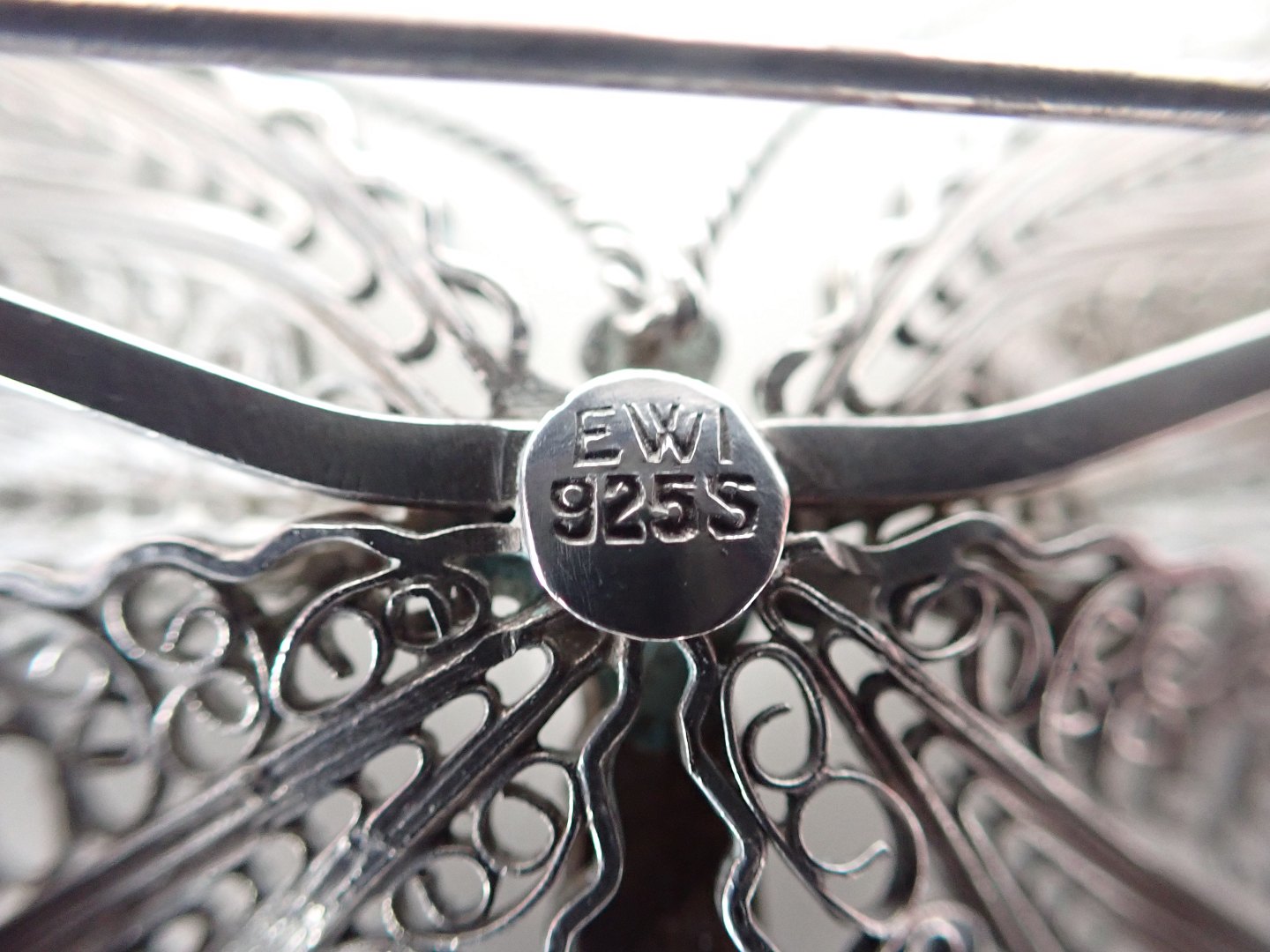 Sommerfuglebroche: dansk broche i sterling sølv Stemplet UW 925. Dansk ca. 1950. Vægt: 12,5 gram. Bredeste diameter: 6,2 cm. Bredeste højde: 4 cm. I fin stand. Solgt.