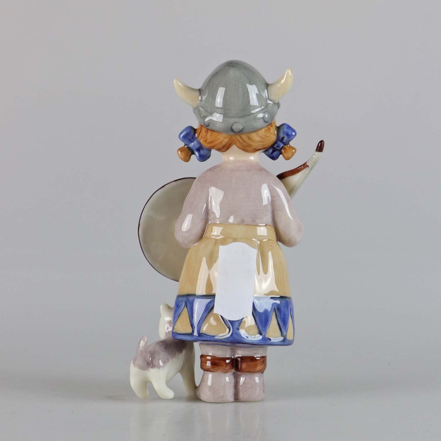 Beskrivelse: Årets Viking 2003 i porcelæn fra serien Mini Collection Viking. Pige med skjold, bue og kat. No 086 Vikingenavn: Freja.