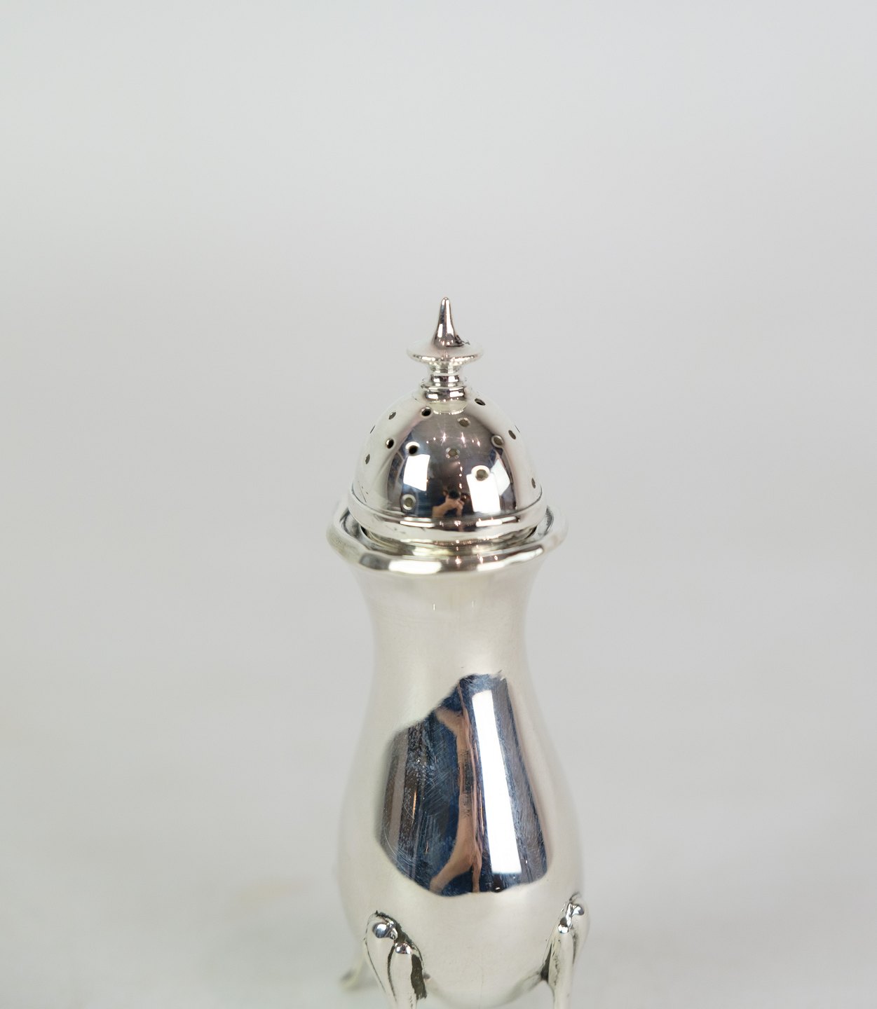 Description: Simple salt shaker on feet, stamped the three tower with master stamps number 16. Weight: 38g