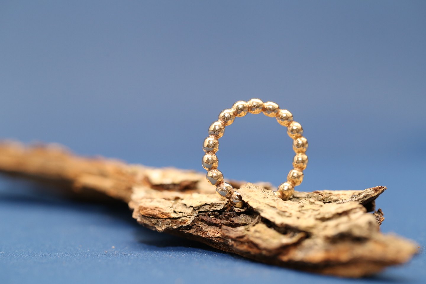 Beskrivelse: Smuk guldring i 14 karat guld, smedet som guldkugler i ring. Flot simpel ring, der sagtens kan kombineres med andre ringe. Ringen har størrelse 55. En ideel gave ide til en større anledning.