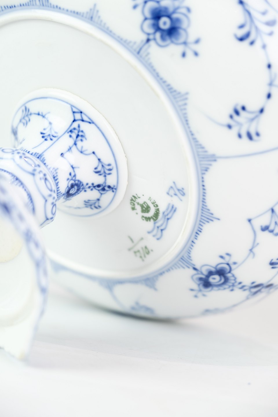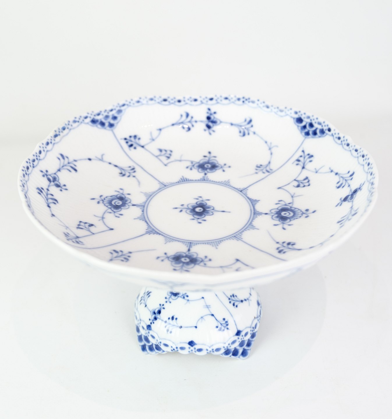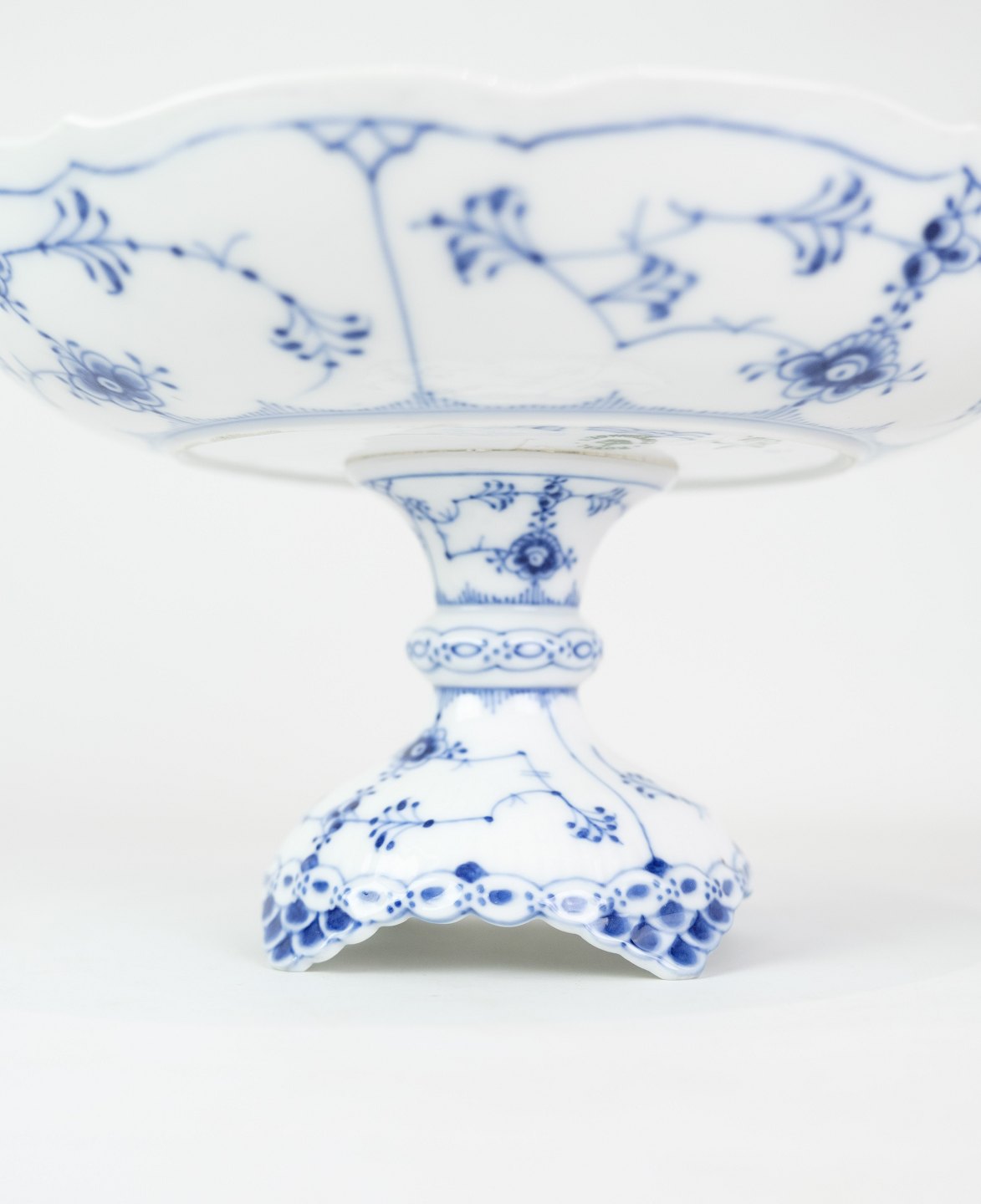 Musselmalet mønsteret, der er et af Royal Copenhagens mest ikoniske design, består af fine blå mønstre inspireret af skaller og muslinger. Dette mønster pryder opsatsen og giver den et klassisk og tidløst udseende.