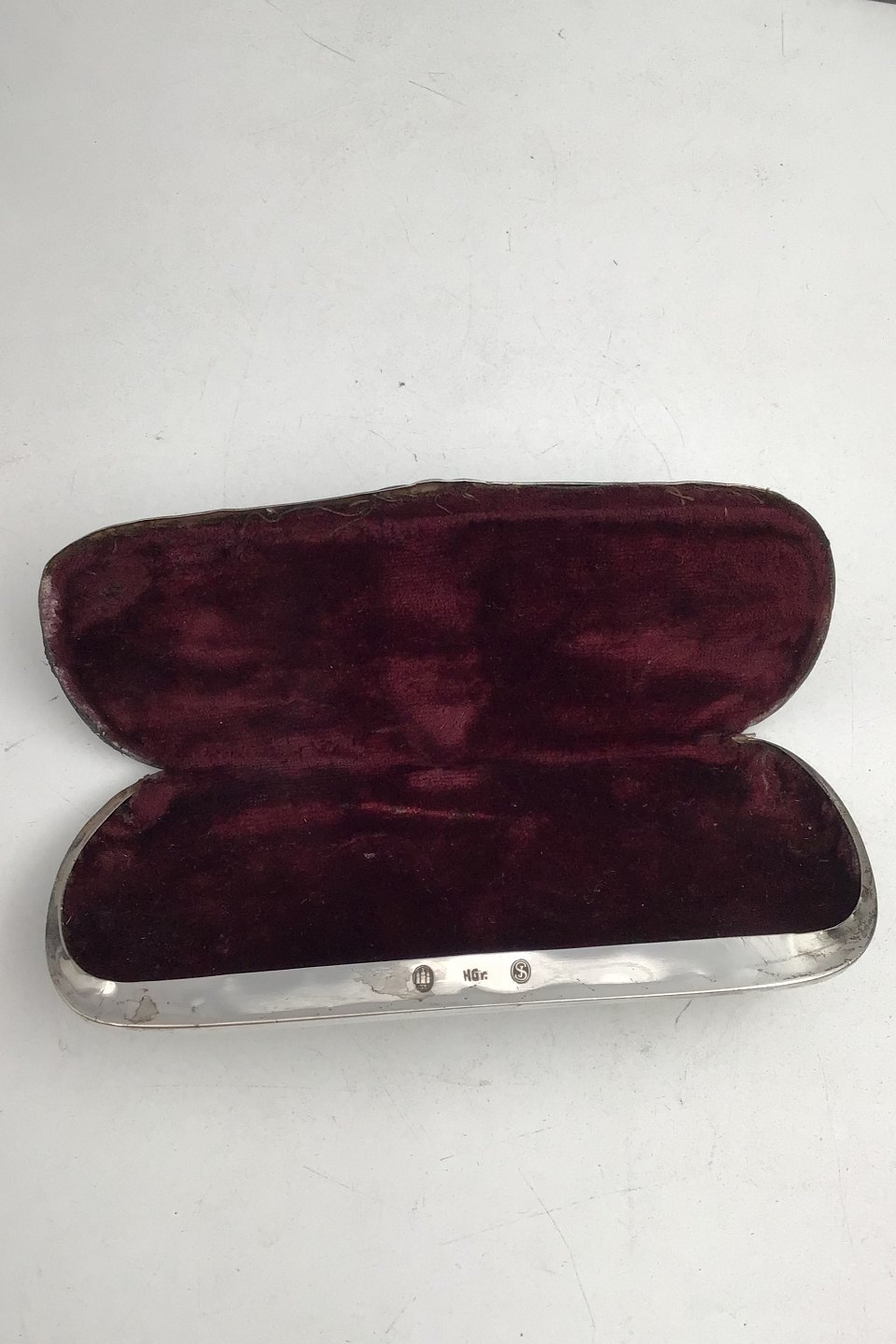 Beskrivelse: Hugo Grün Sølv Brille Etui (1933) Måler 13.8 cm x 5.8 cm x 2 cm (5.43 inch x 2.28 inch x 0.78 inch) Vægt 80 gr (2.83 oz) (Graveret / Brugsspor)