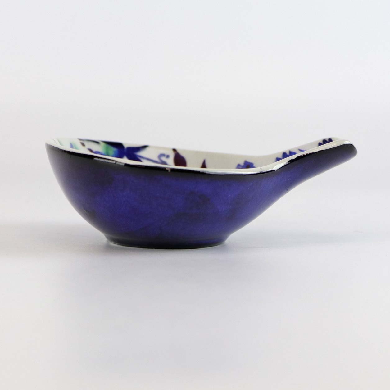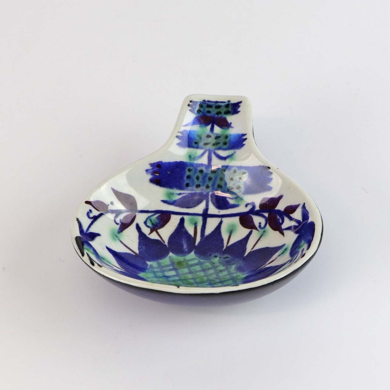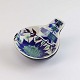 Beskrivelse: Tenera lille skål med hank i fajance nr 145/2898 med blomstermønster i blå, grønne og røde farver