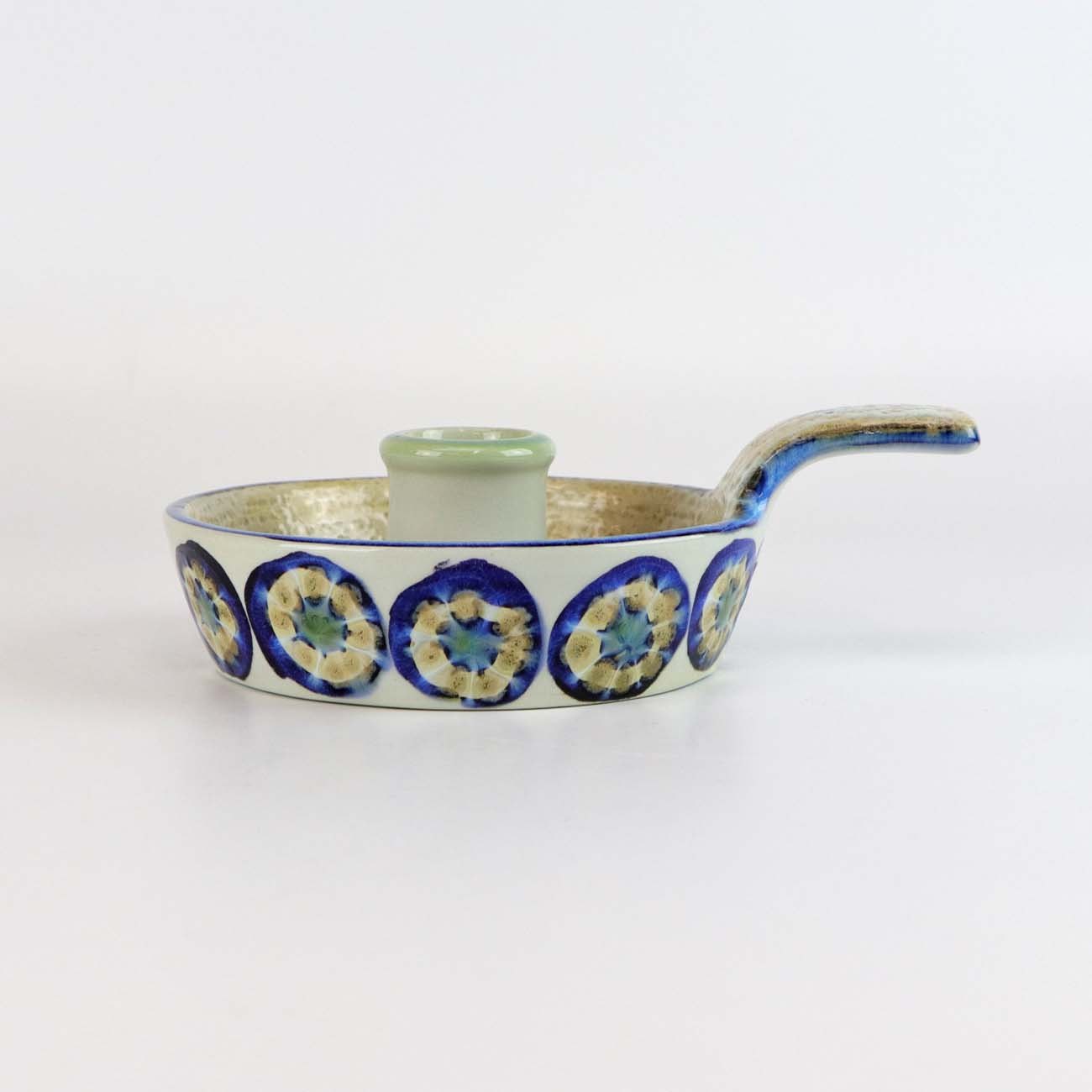 Beskrivelse: Lav Tenera stage i fajance nr 589/3367 med form som en kammerstage med sturktureret inderside i brunlig nuance omgivet af abstakte motiver i gule og blå farver på lys baggrund