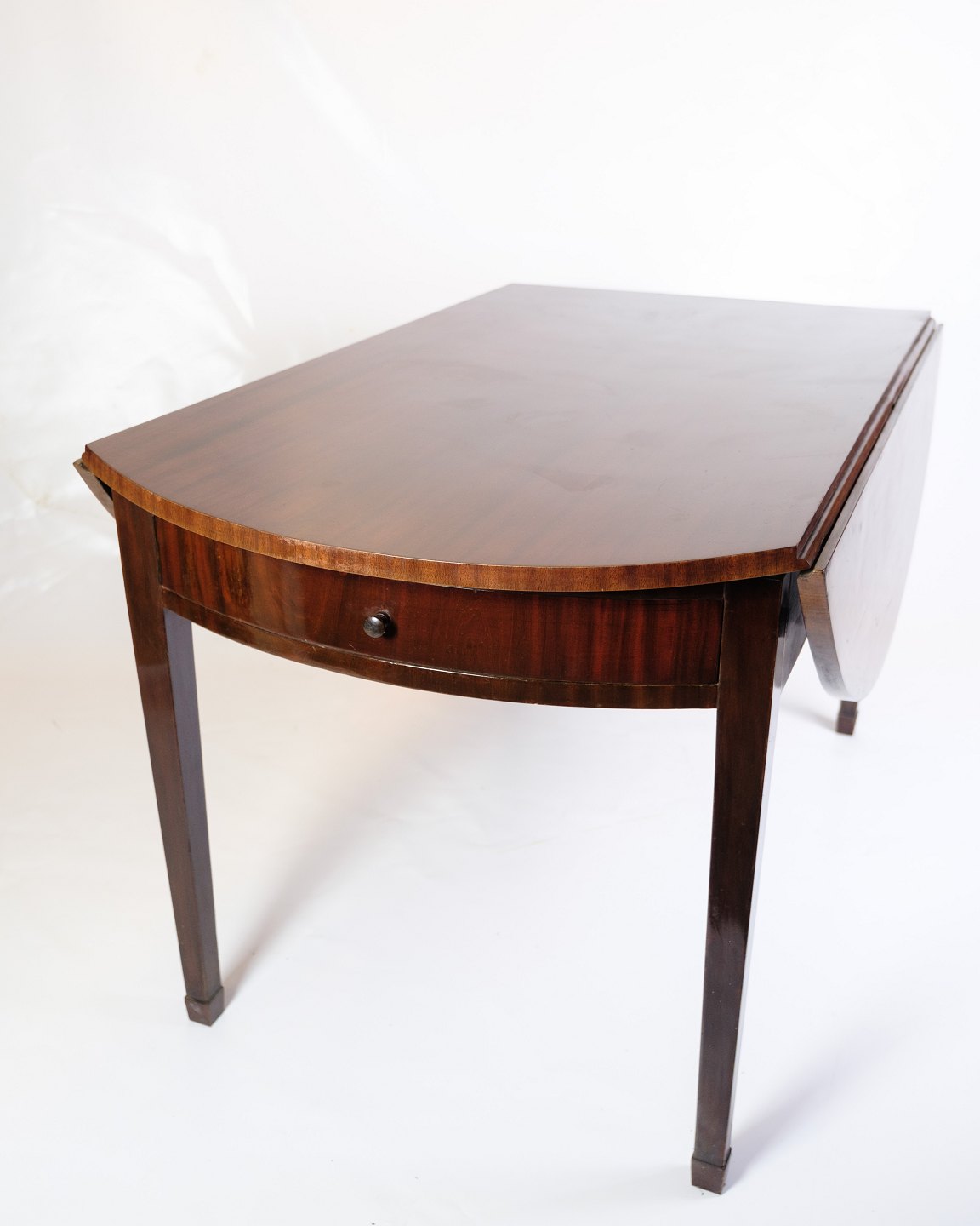 Beskrivelse: Dette antikke klapbord/spisebord fra cirka 1840 er et vidunderligt eksempel på klassisk håndværk og tidløs elegance. Fremstillet af poleret mahognitræ udstråler bordet varme og skønhed med sit smukke træmønster. Det unikke design inkluderer en praktisk skuffe, der tilføjer funktionalitet til bordet. Med sin ældre alder bærer bordet en autentisk patina, der kun øger dets historiske appel.