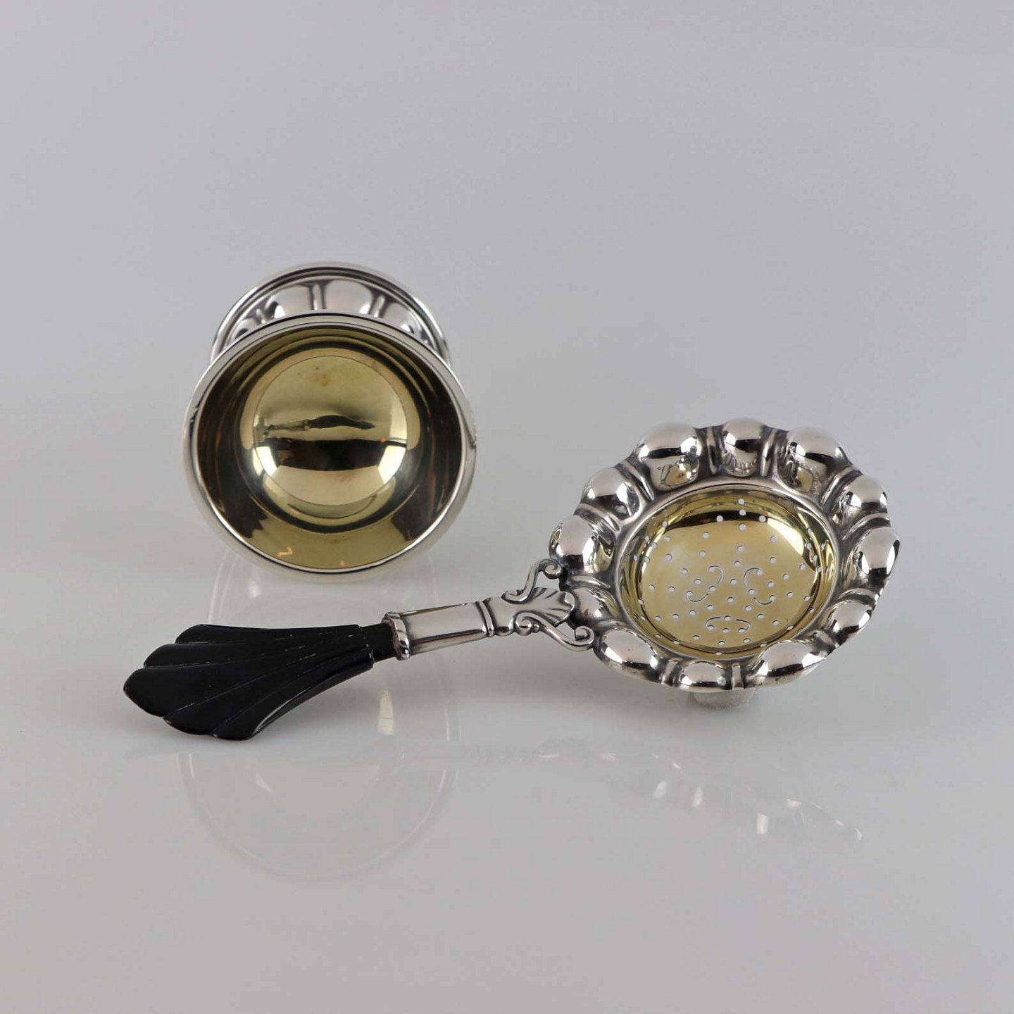 Beskrivelse: Tesi i sølv med holder og håndtag i sort plast