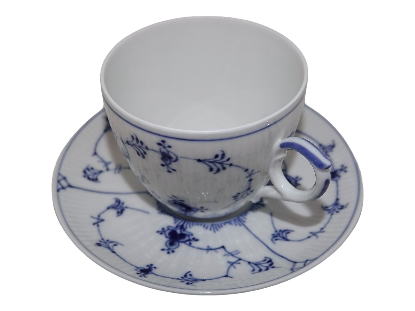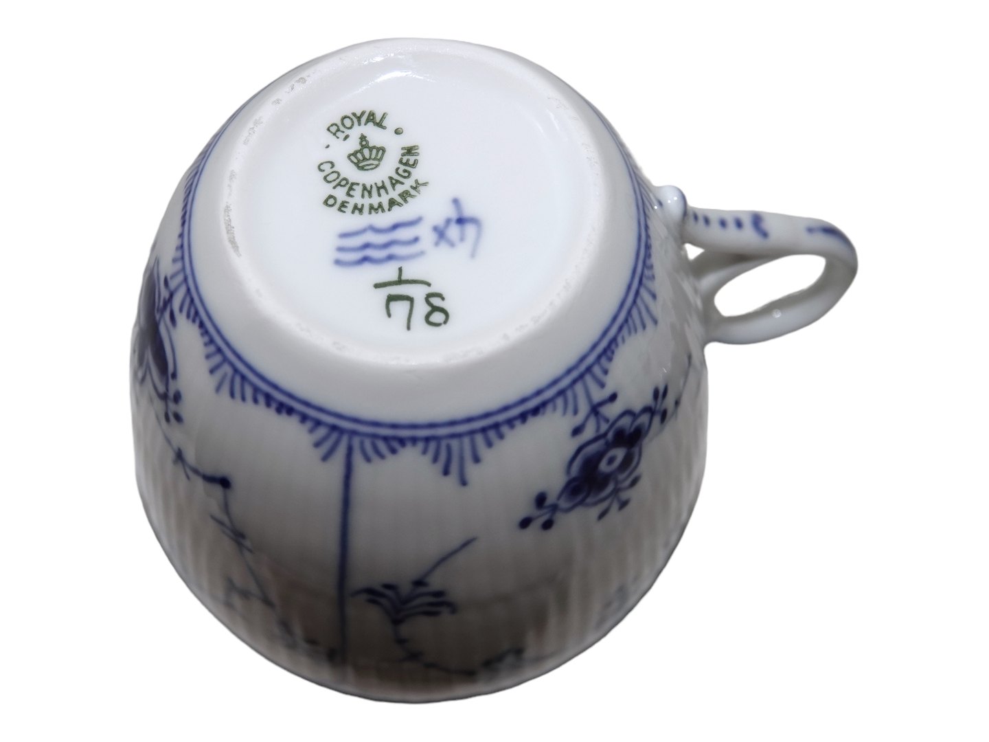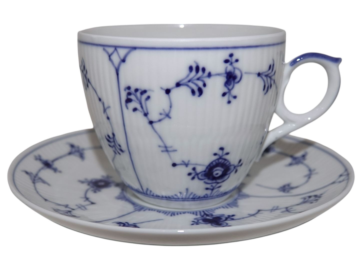 Beskrivelse: Royal Copenhagen Musselmalet Riflet, kæmpe kaffekop også kaldet en kontorkop eller morgenkop.