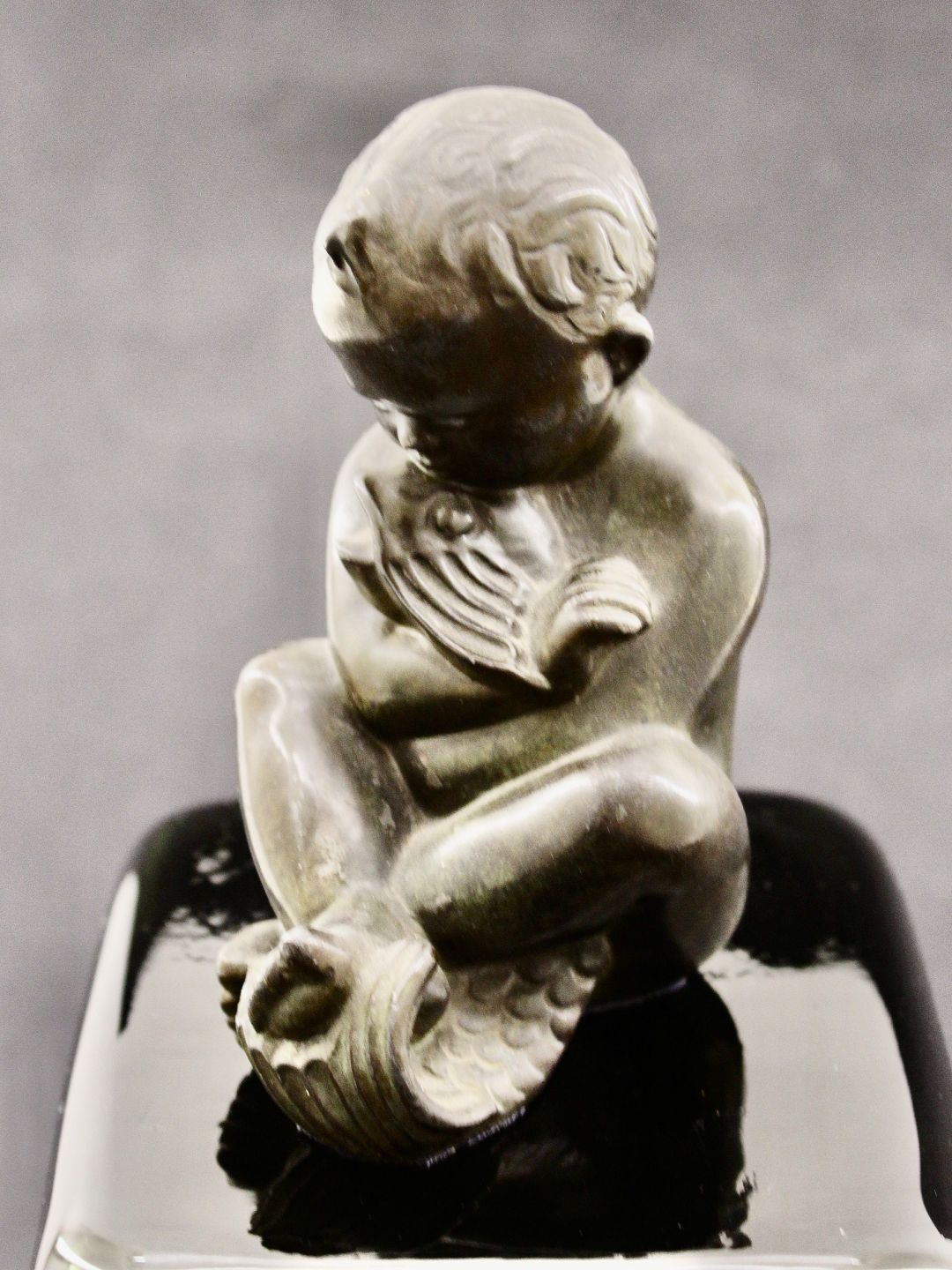 Beskrivelse: Figur dreng med fisk 13,5 cm. bronze farvet metal signeret KJH for k J Hoffmann emne nr. 577498
