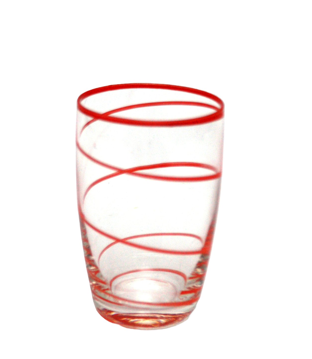 Beskrivelse: Holmegaard glasværk, Drikkeglas/vandglas/sodavandglas med spiral og kant i emaljefarver. Nr. 8897-9077. Designet af Jacob E. Bang i 1937 og udgået i 1957. Højde 9 cm. Diameter 5,8 cm. Pris: 100 kr. stk.