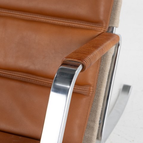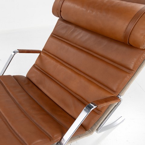 FK 87 - 'Grasshopper' easy chair/chaise longue in cognac leather and chrome-plated steel. Designed in 1965.