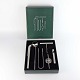 Beskrivelse: Service sæt til bar i rustfrit stål med seks forskellige dele. Sættet består af oplukker, proptrækker, målebæger, tang, ske og kniv. Opbevaret i original æske