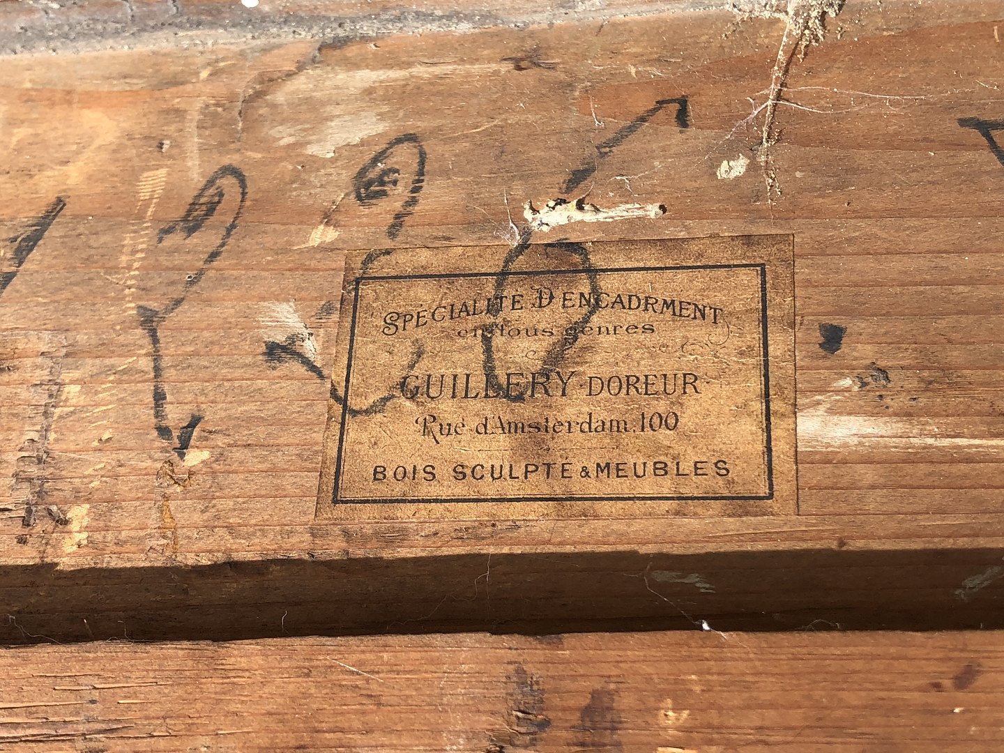 Description: Older central European landscape painting with shepherd. On the reverse marked from the framing at: Rue d'Amsterdam 100, Paris. Has severe chipping on the frame and with cracks/age-related traces on the painting. Dimensions with frame: 90x80 cm