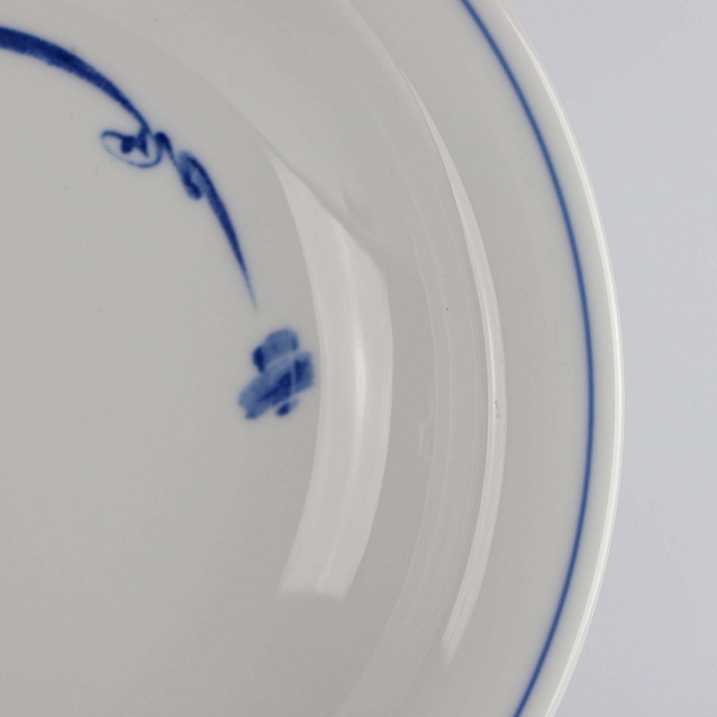 Suppetallerken i glat hvidt porcelæn med abstrakt mønster i blå nuancer