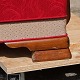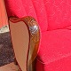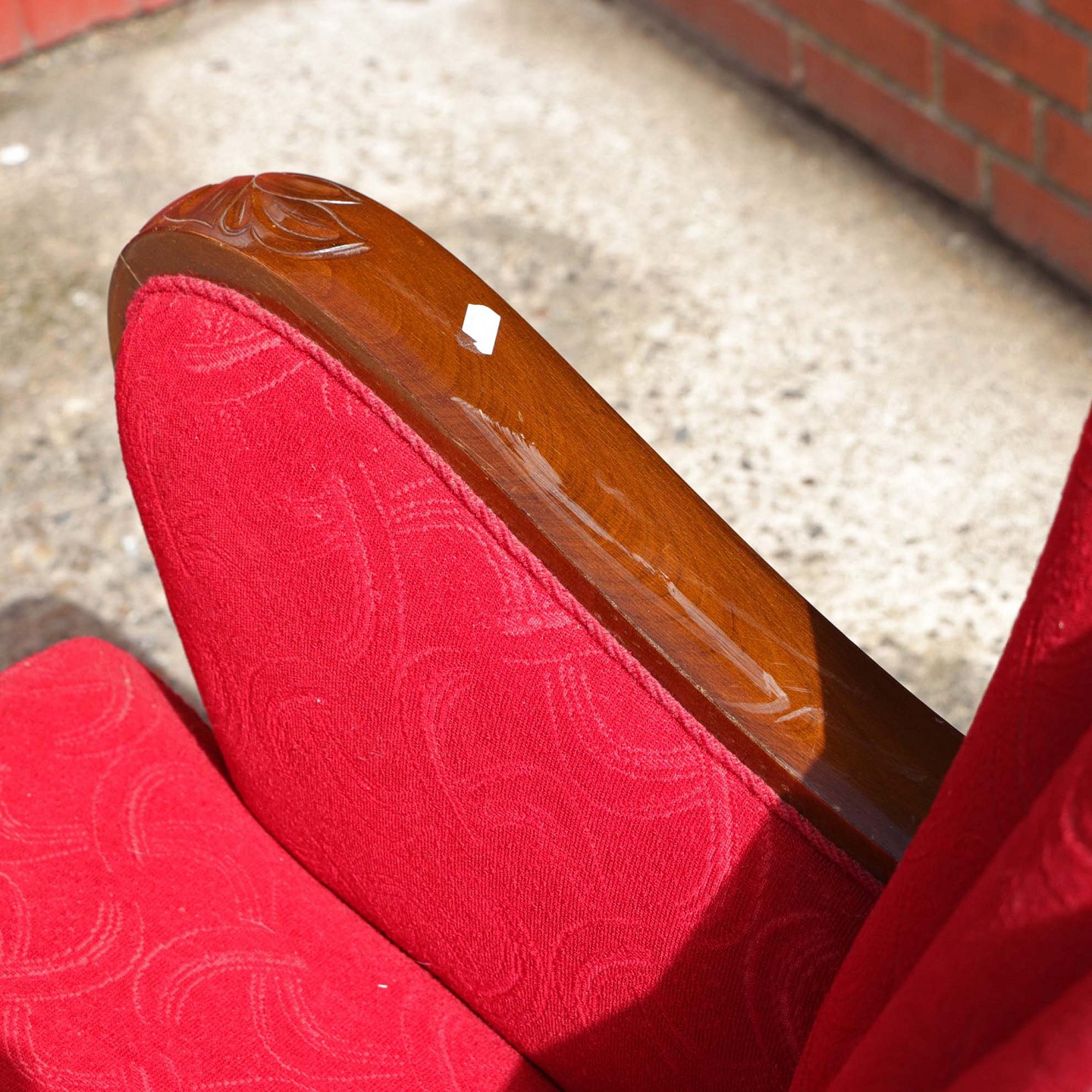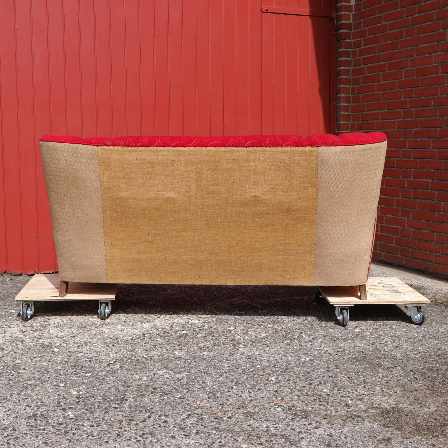 Beskrivelse: Overpolstret tre personers sofa med lakeret armlæn og ben i mørkt træ og polstret med rødt struktureret stof.
